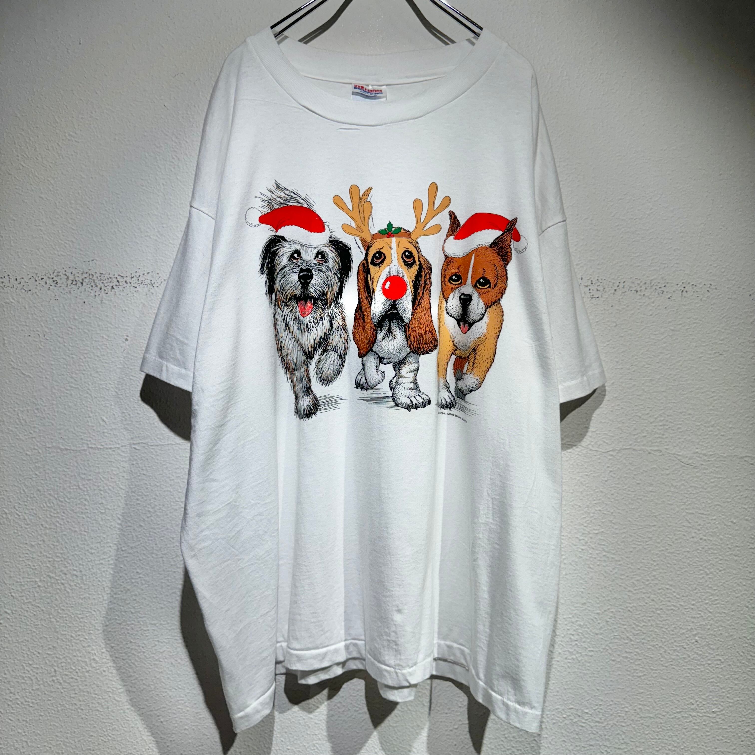 90年代 クリスマスの装いのわんちゃんがフロントとバックにデザインされたキュートなtシャツ。