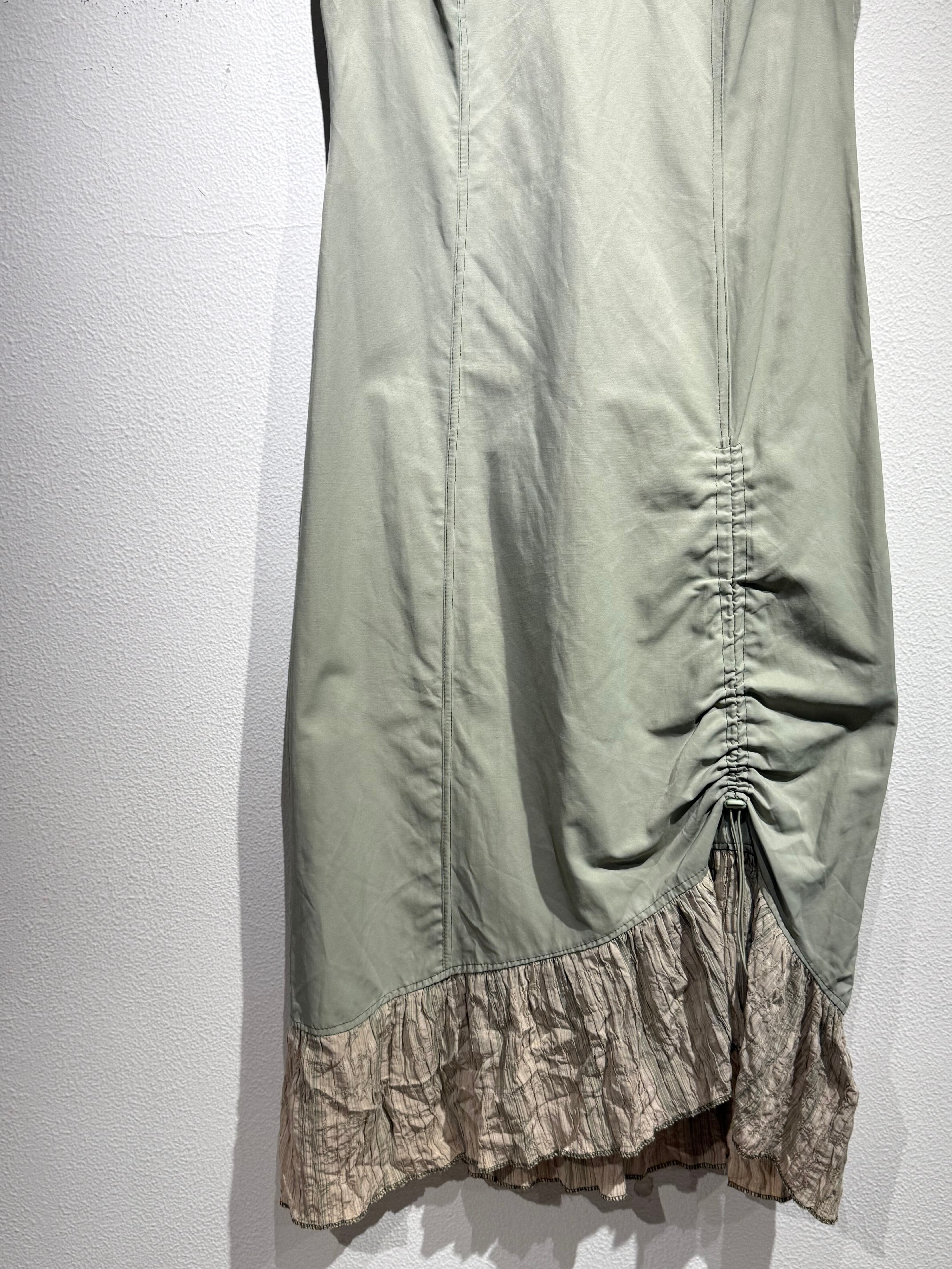 落ち着いたモスグリーンベースのノースリーブワンピース。