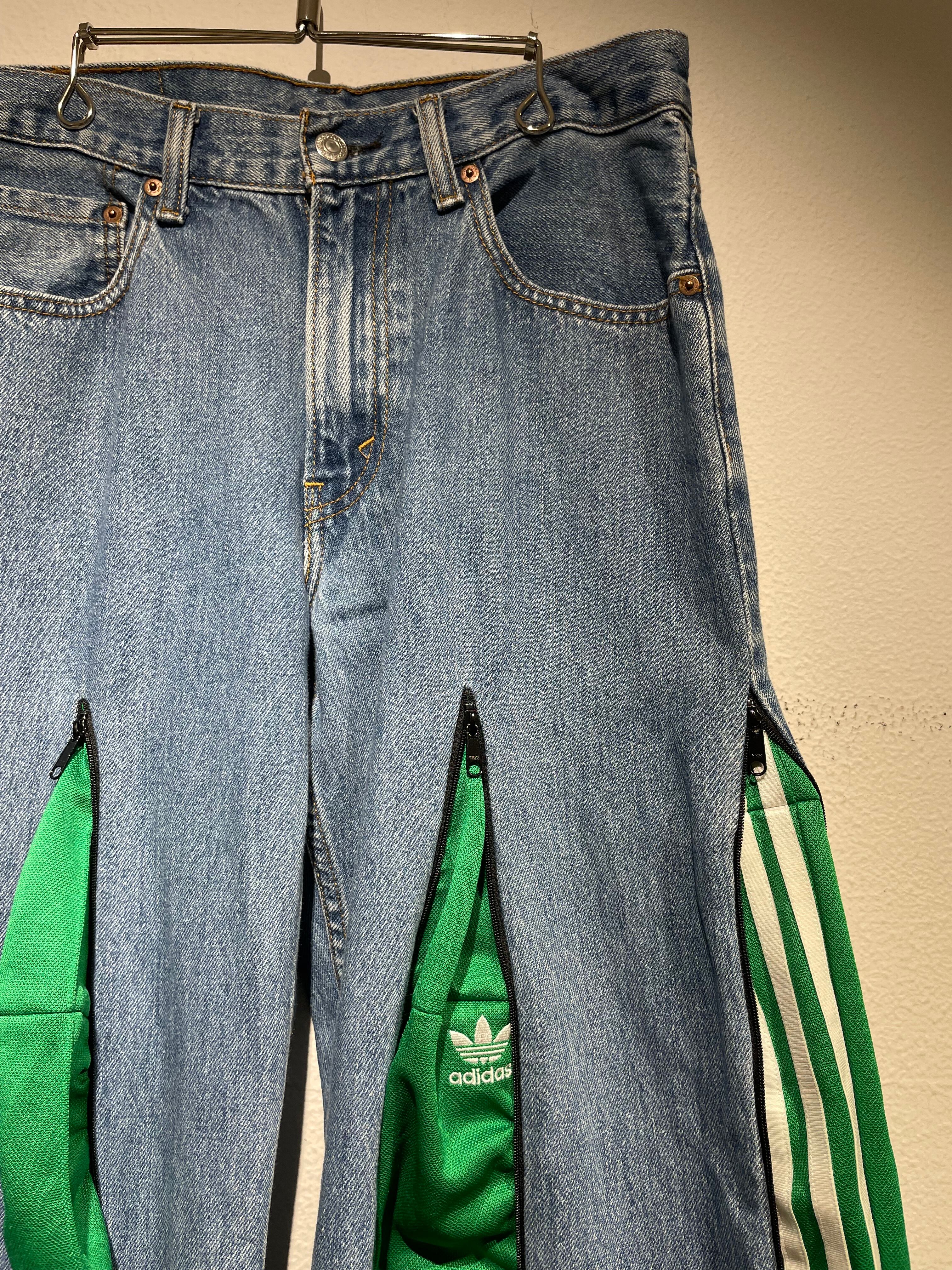 リーバイス×トラックパンツをドッキングしたリメイクパンツ。