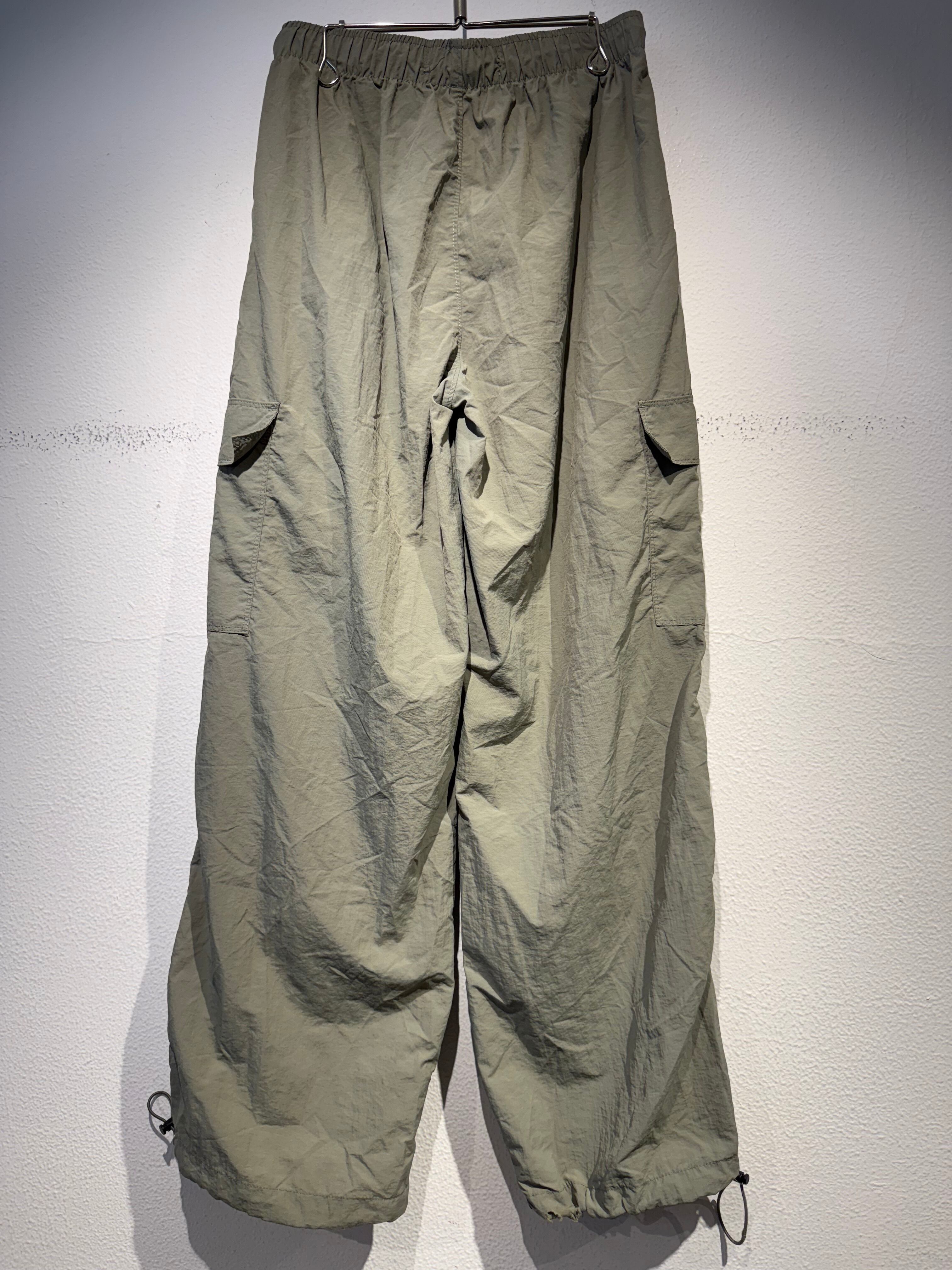 柔らかいカーキ色のナイロンカーゴパンツ。
