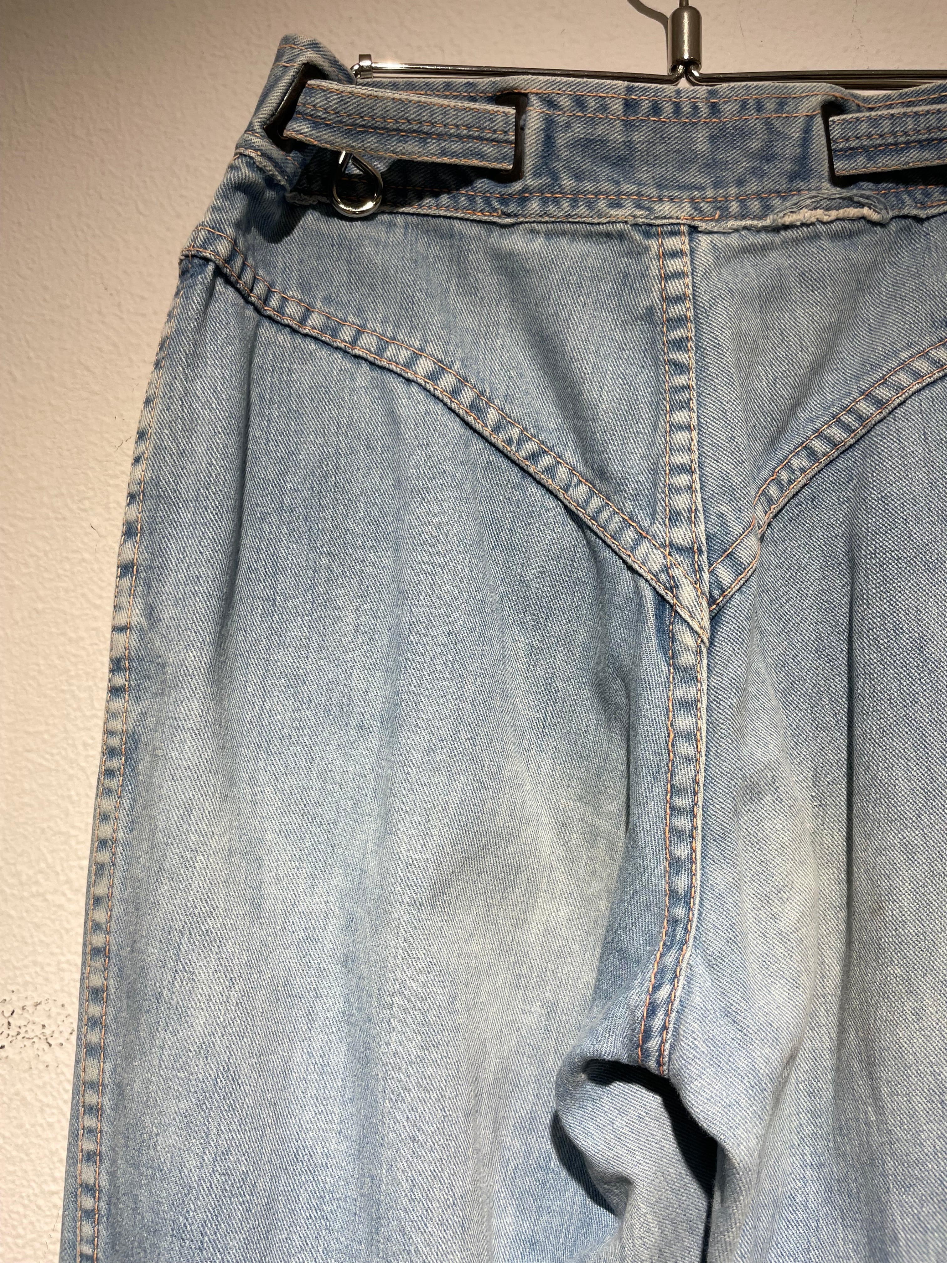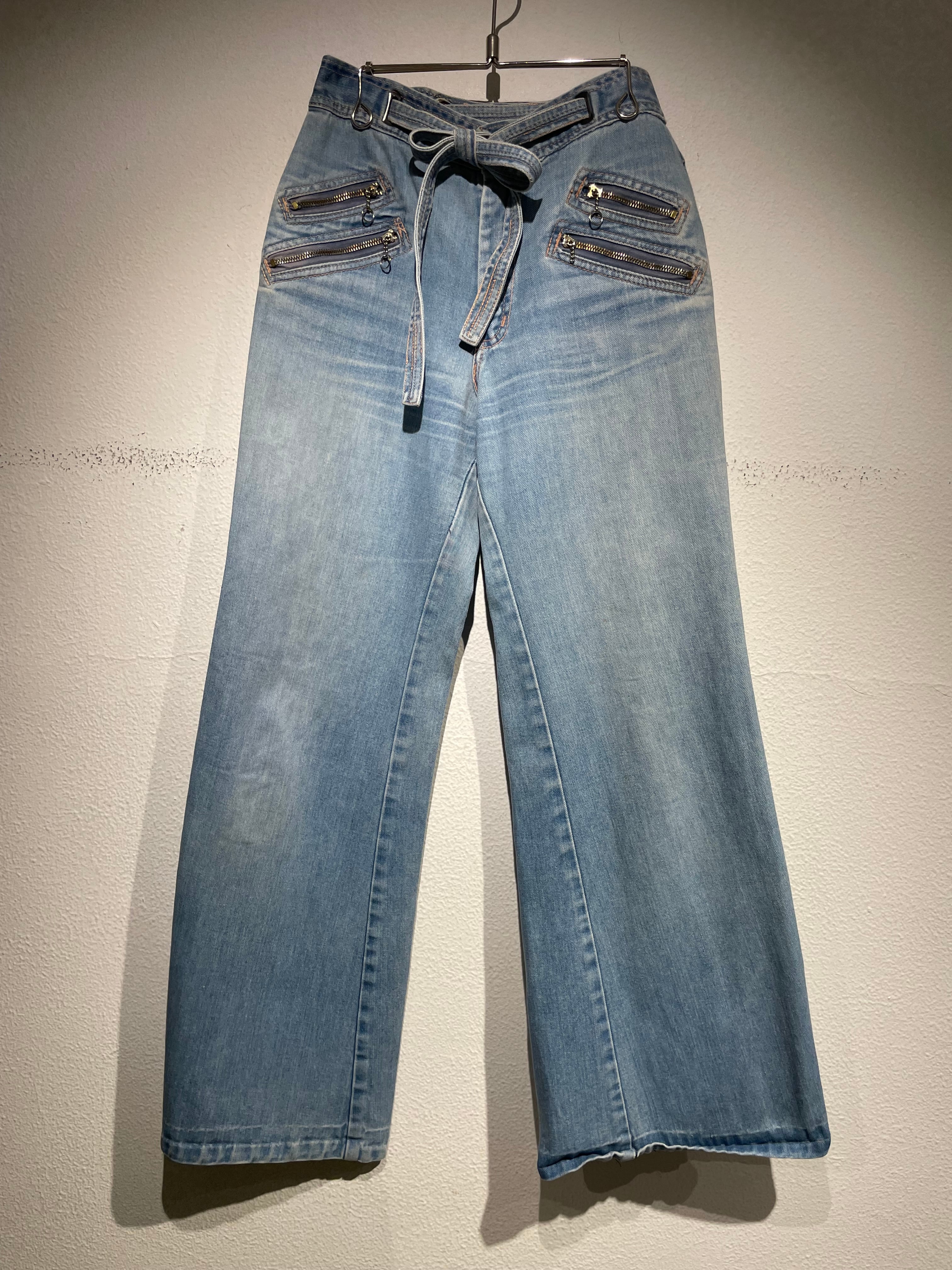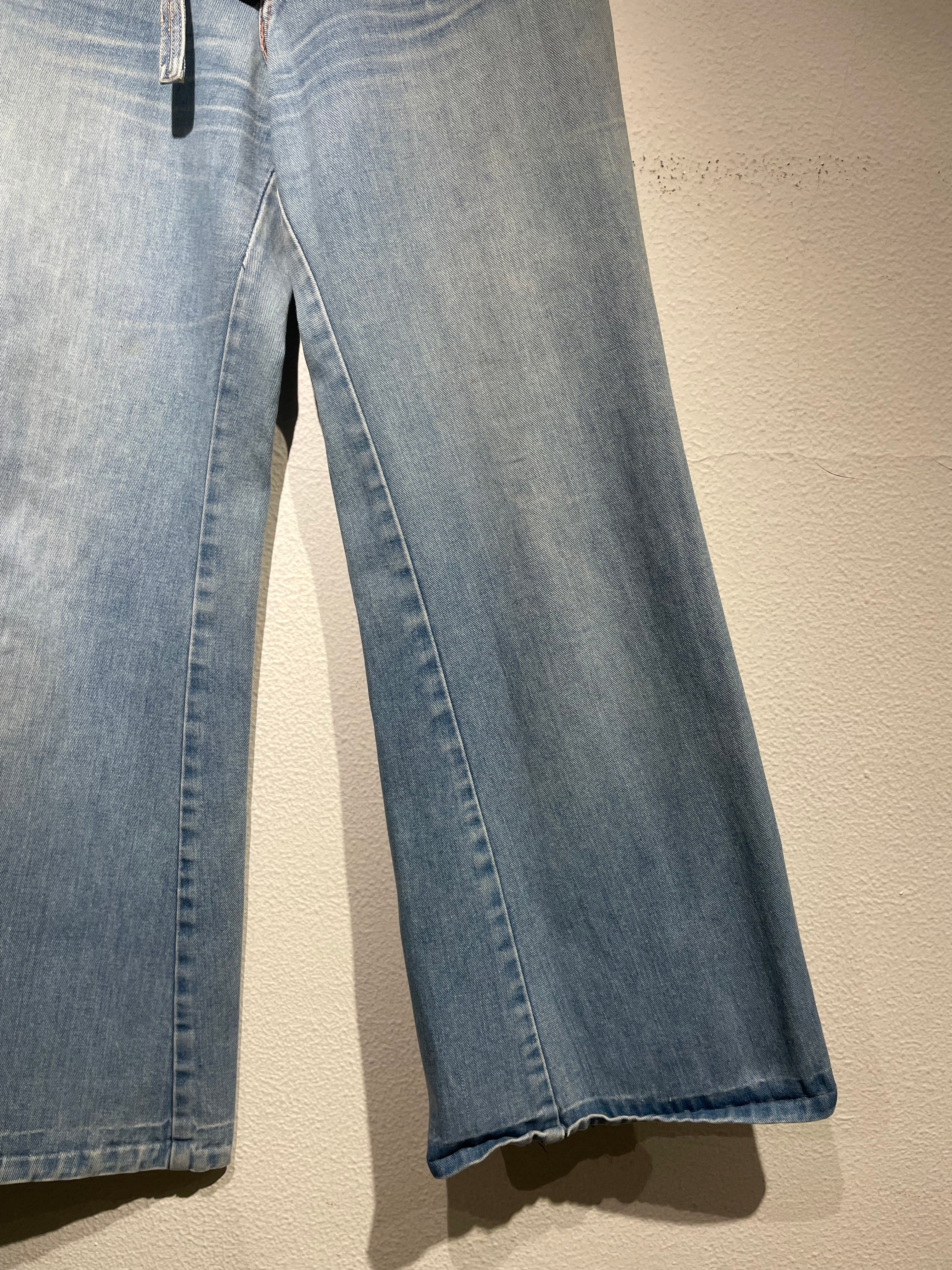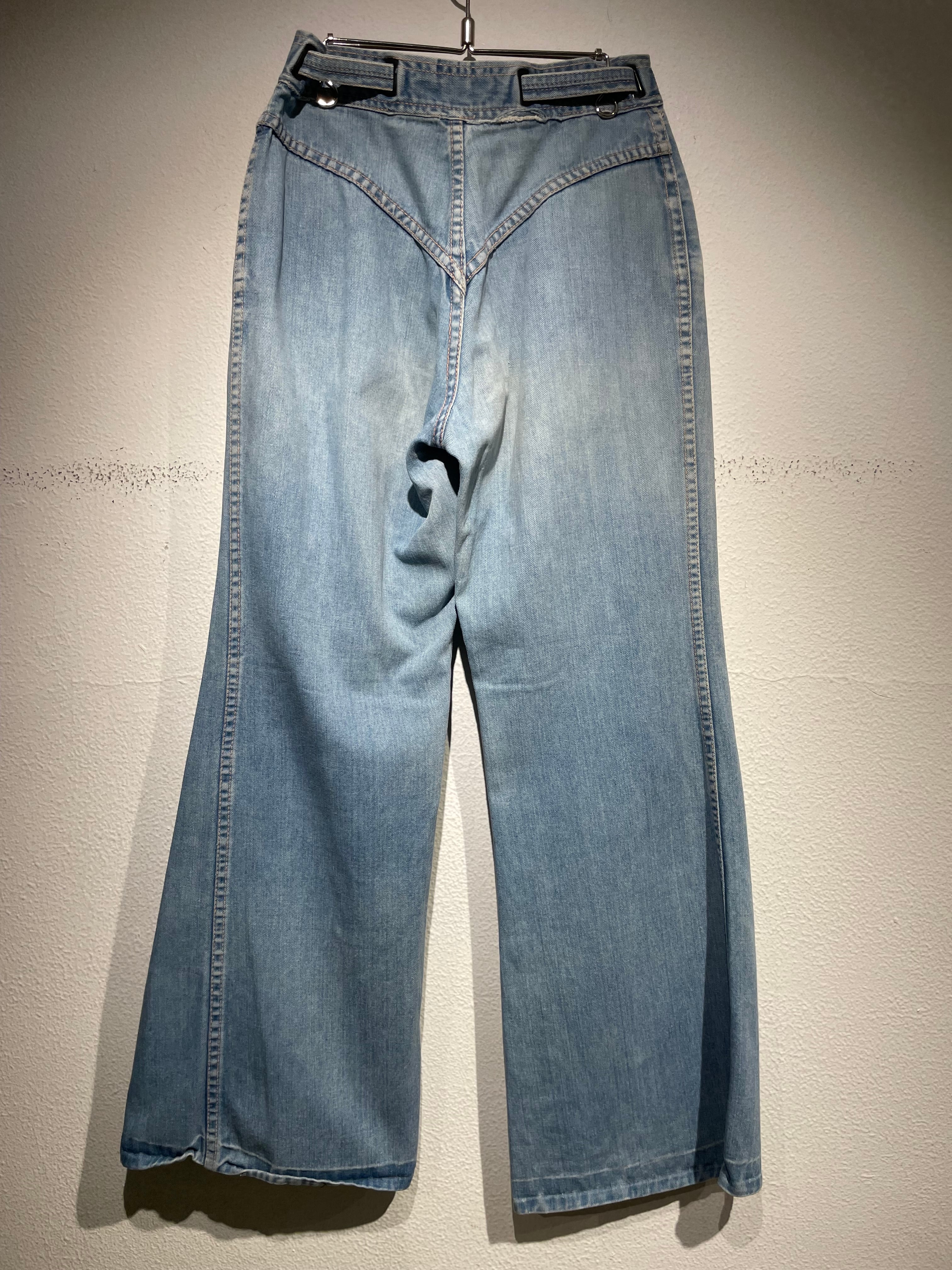 ウエストのリボンや切り替えが目を引くデザインのフレアデニムパンツ。