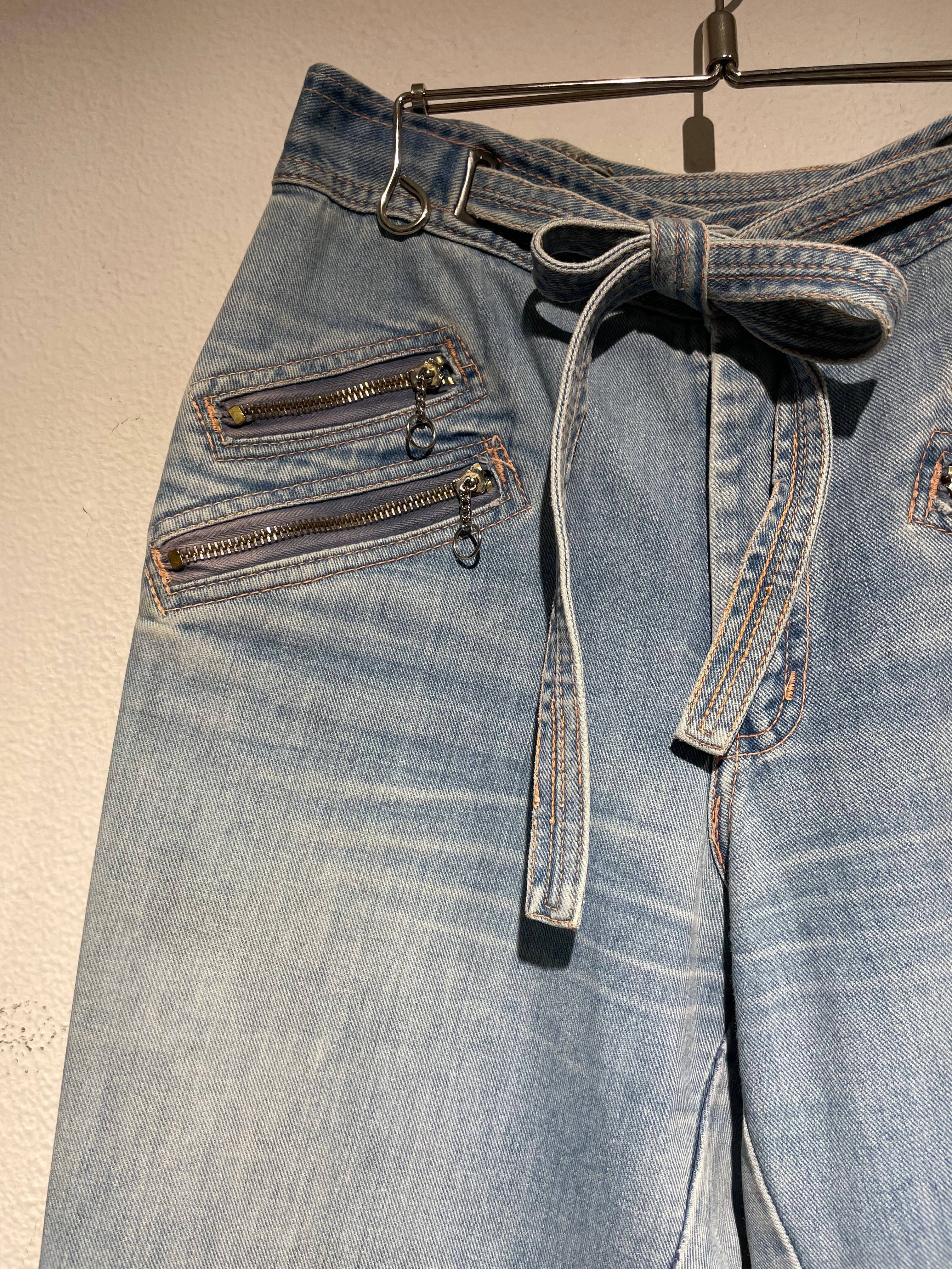 フロントに複数のジッパー付ポケットと、ウエスト部分にはリボンベルトが付いておりお好みで調節可能です◎