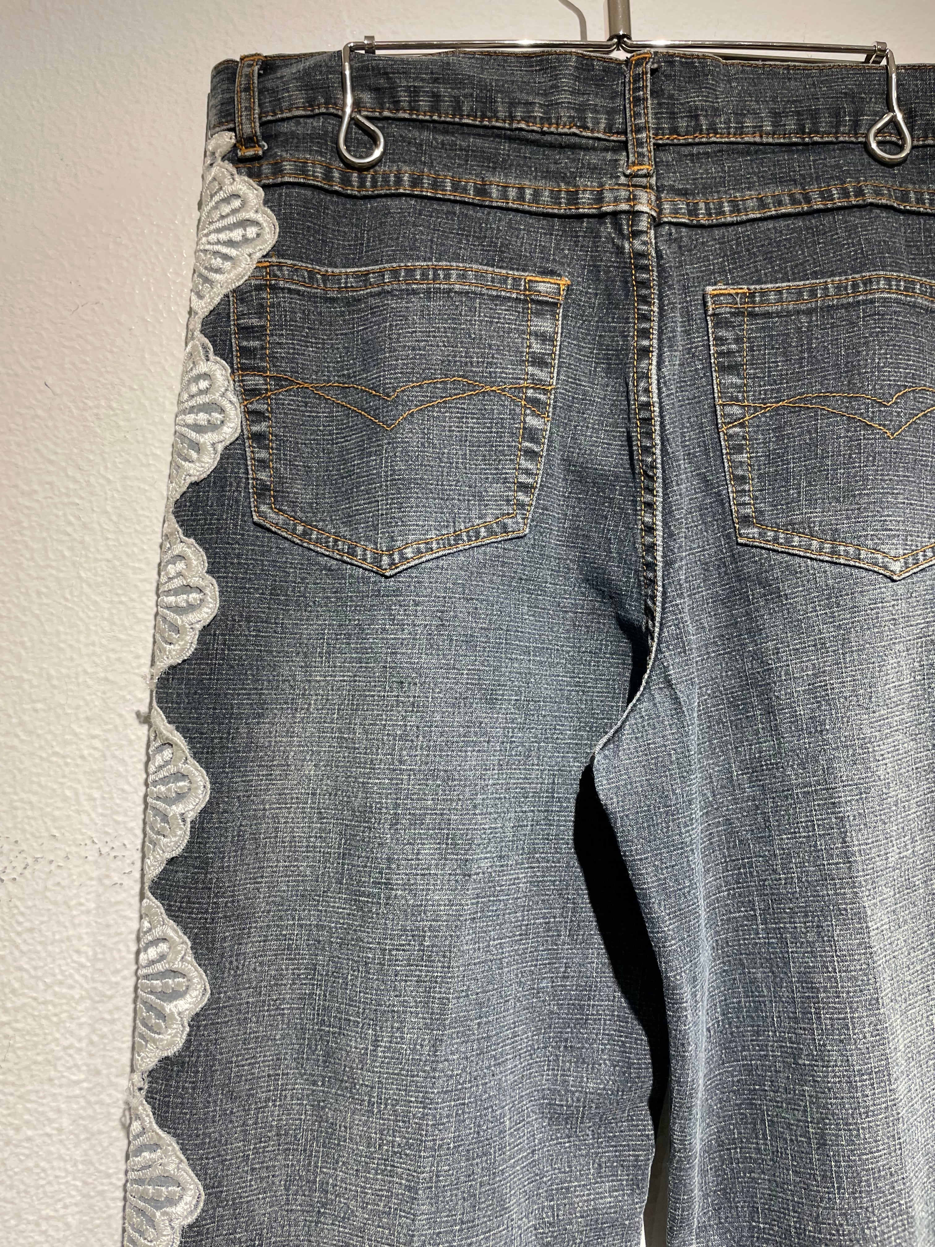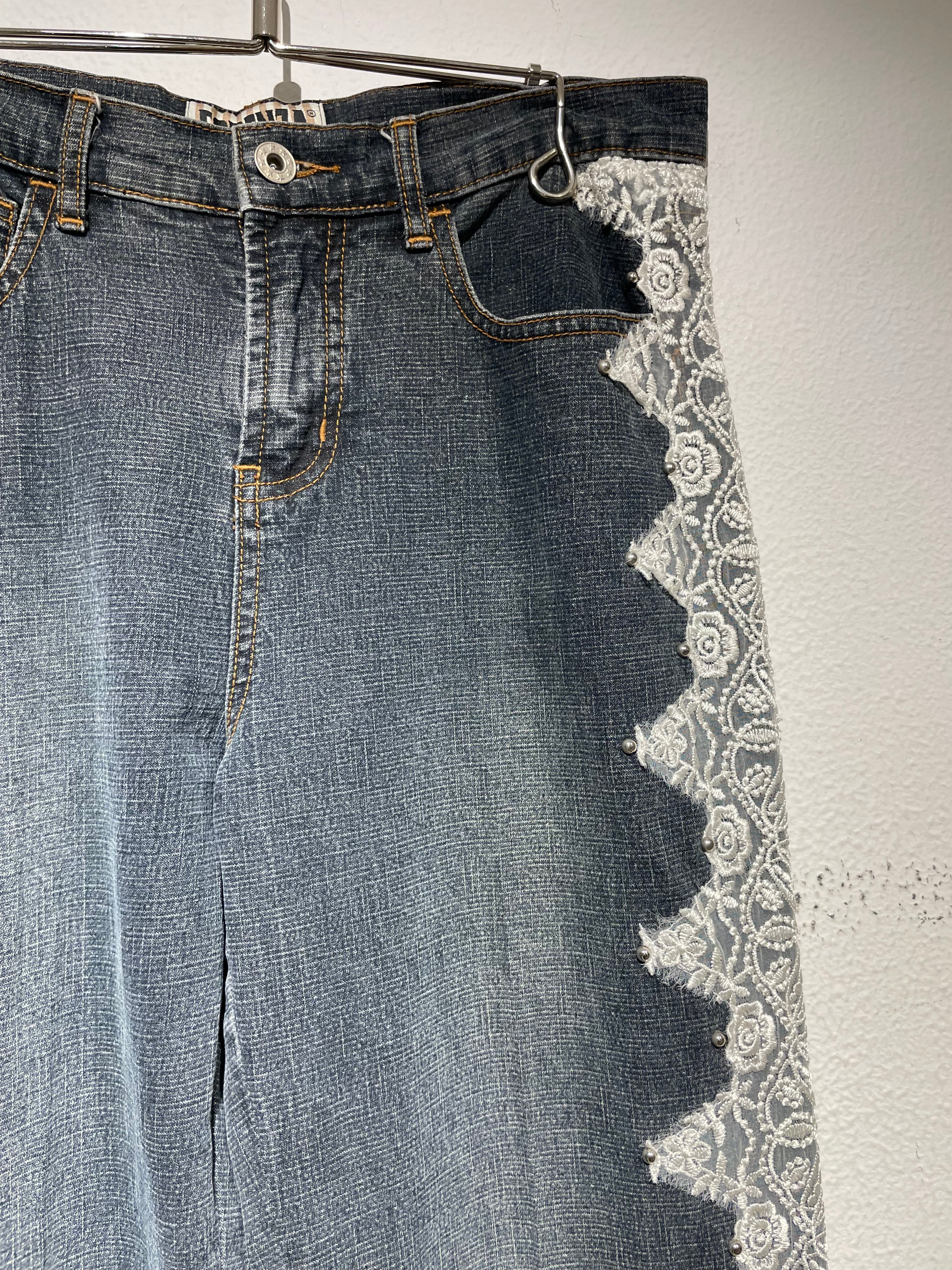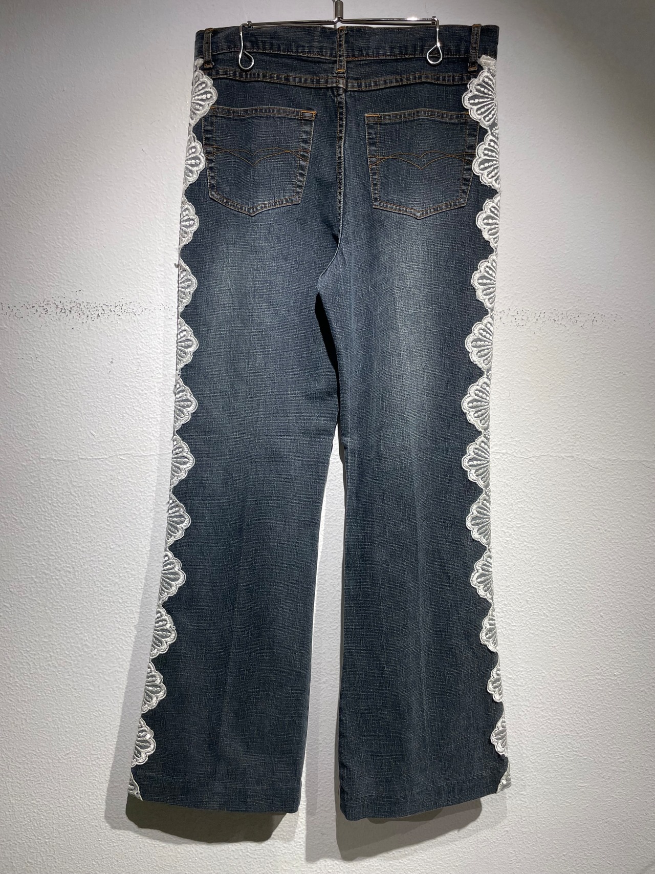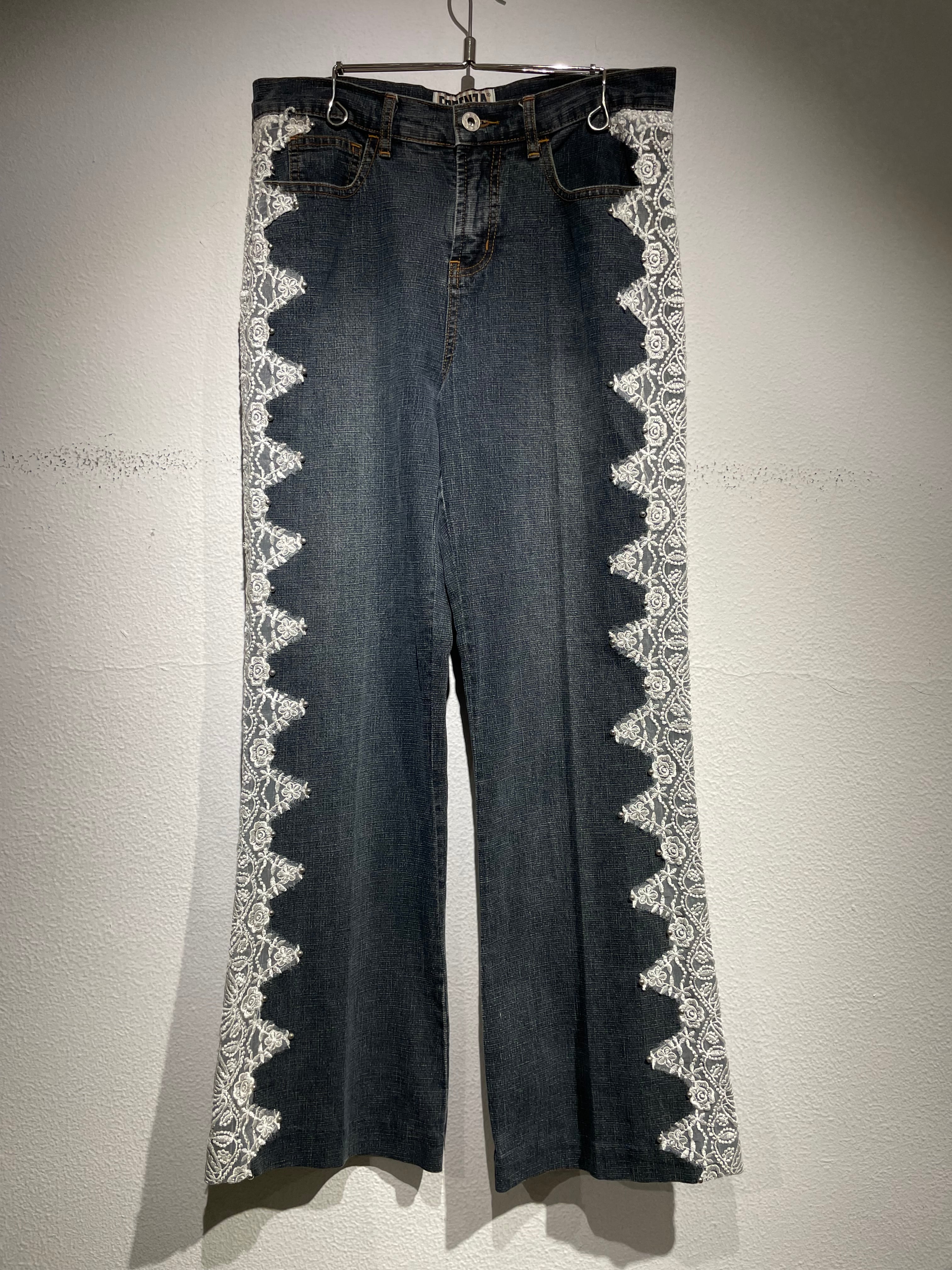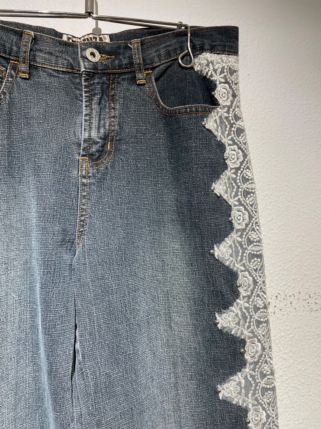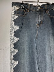 デニムのカジュアルさにレースの華やかさが加わりガーリーで女性らしい印象に◎