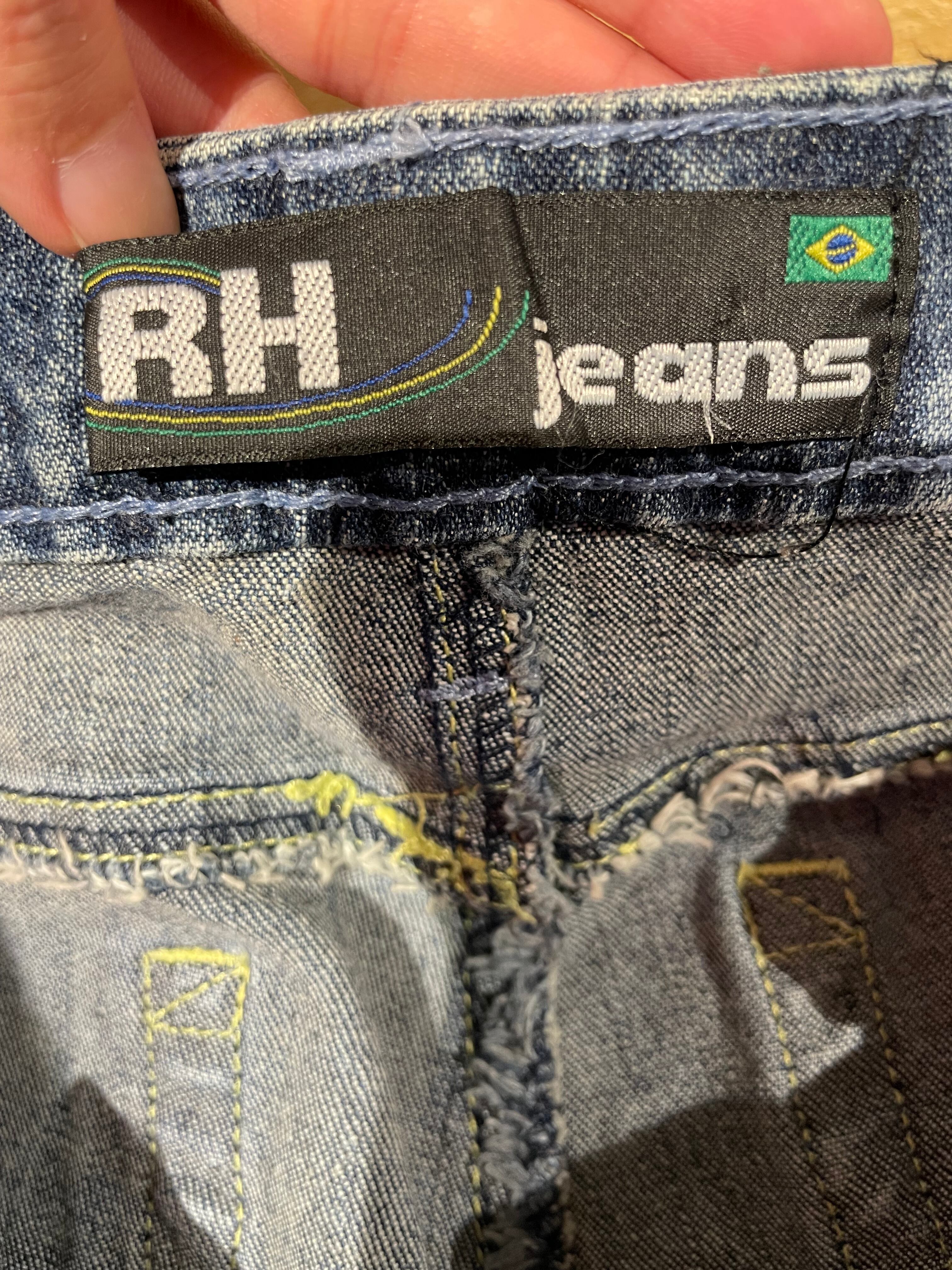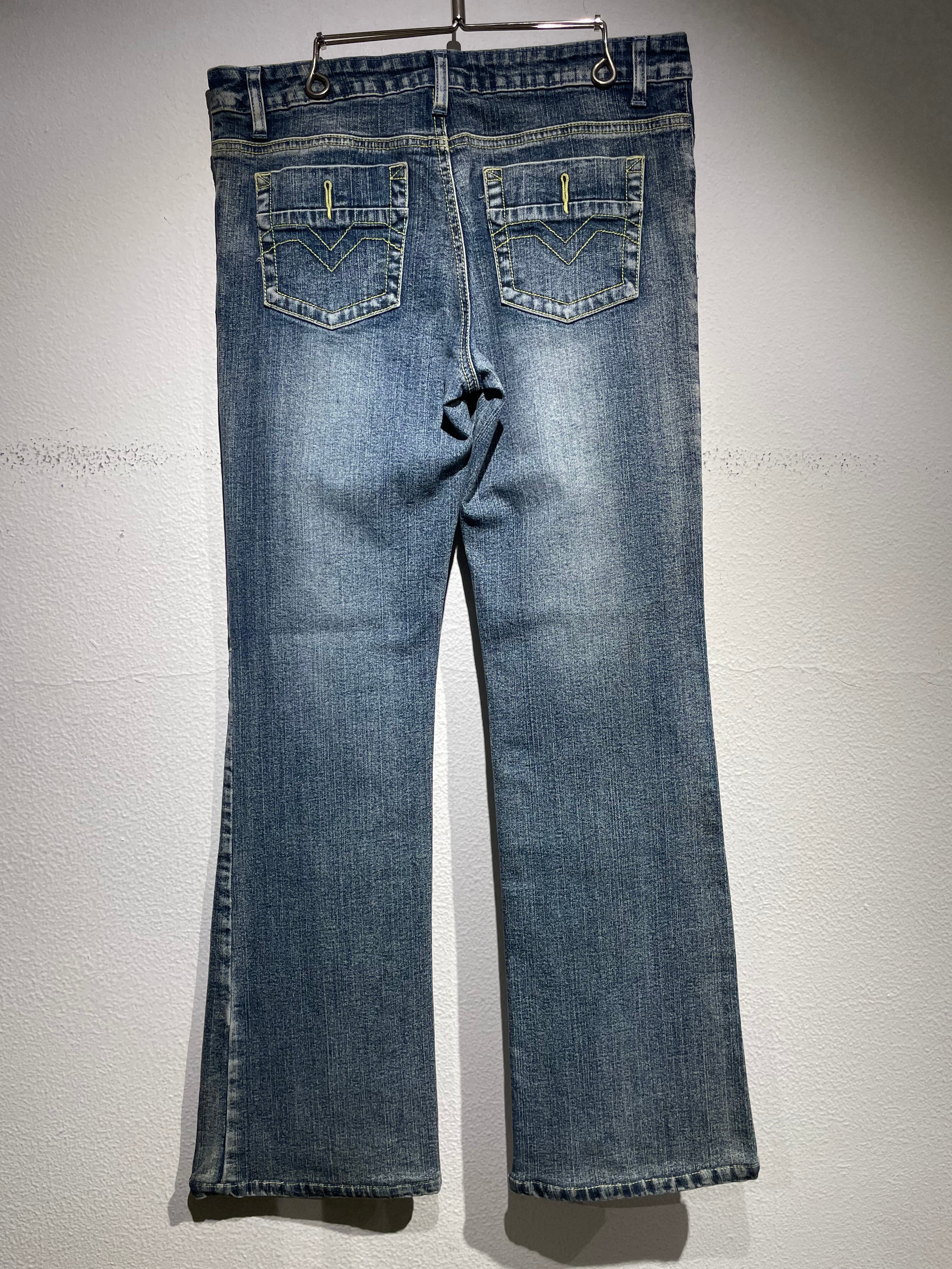 フロントポケット周りにビーズが施されたデニムパンツ。