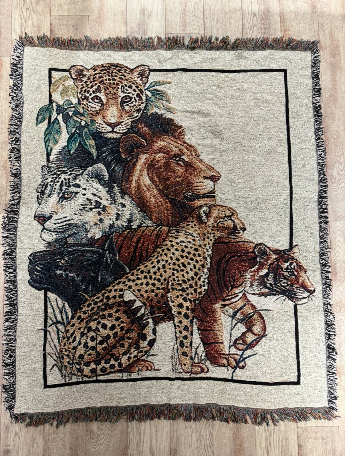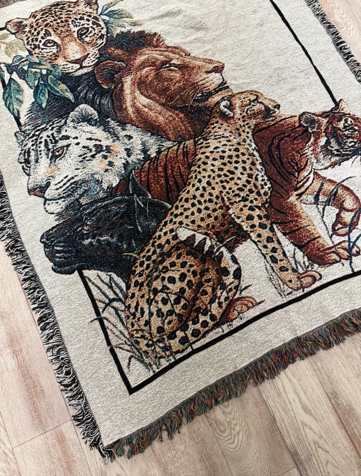 ライオンやヒョウ、チーターなど、力強い野生の猫たちが集うアートラグ。