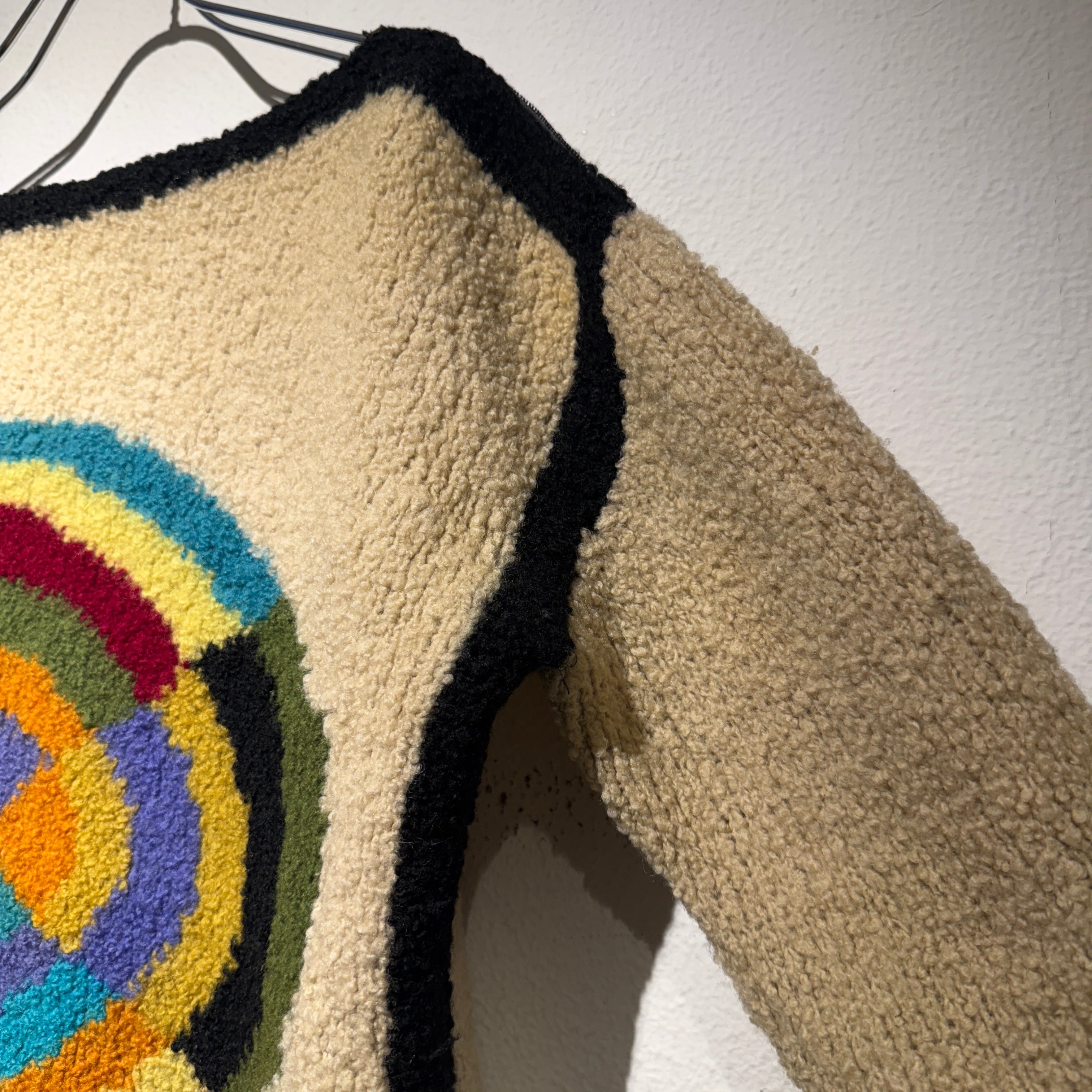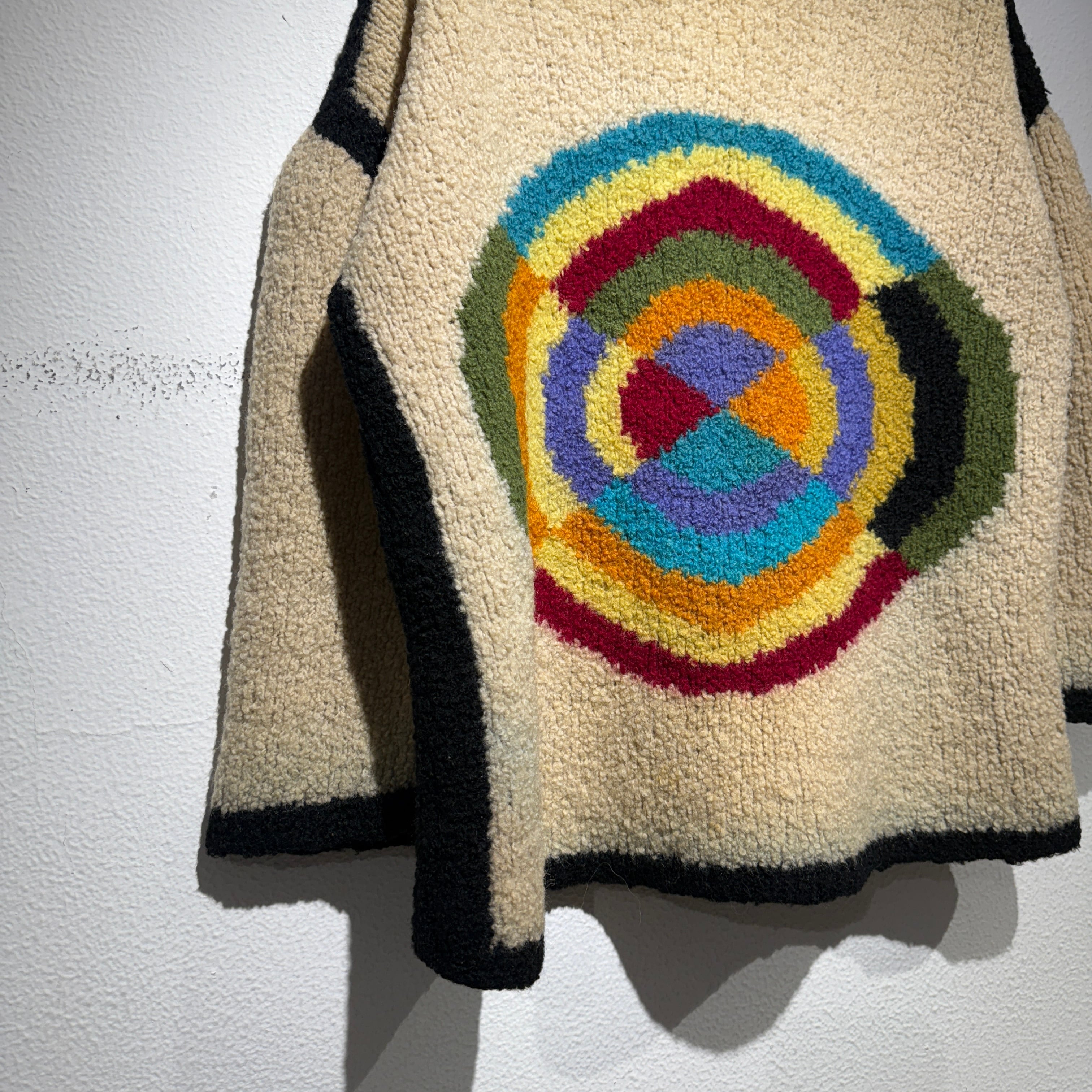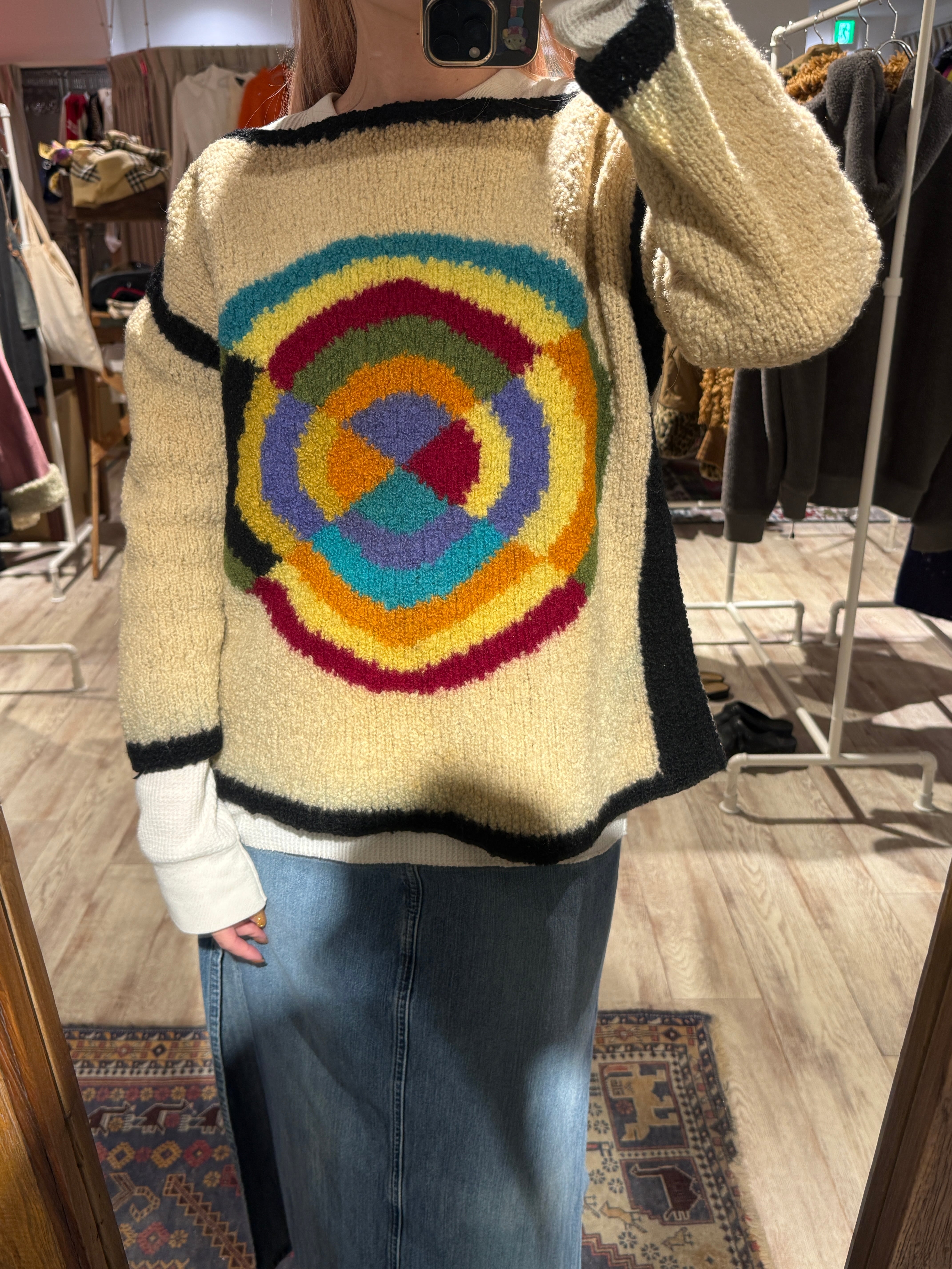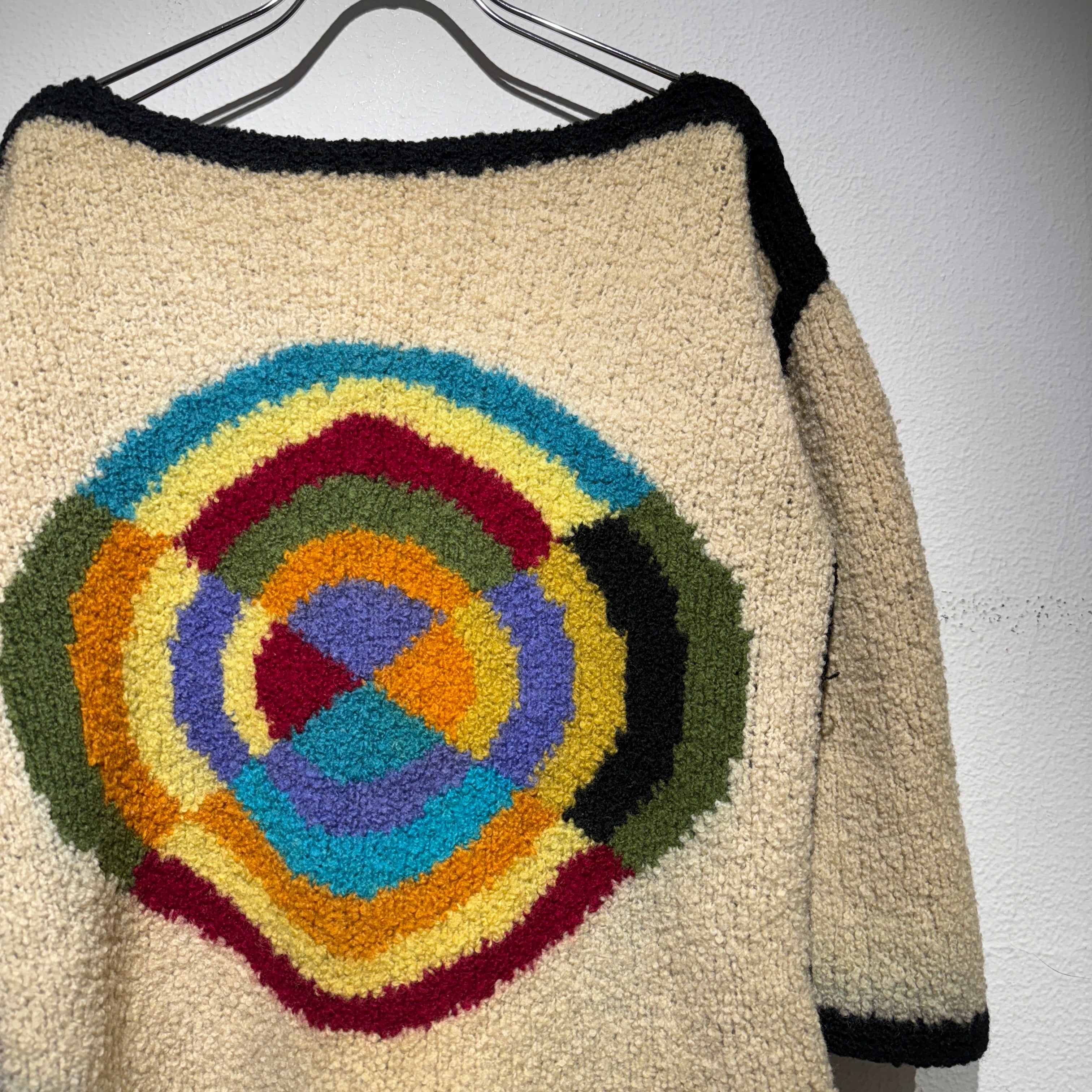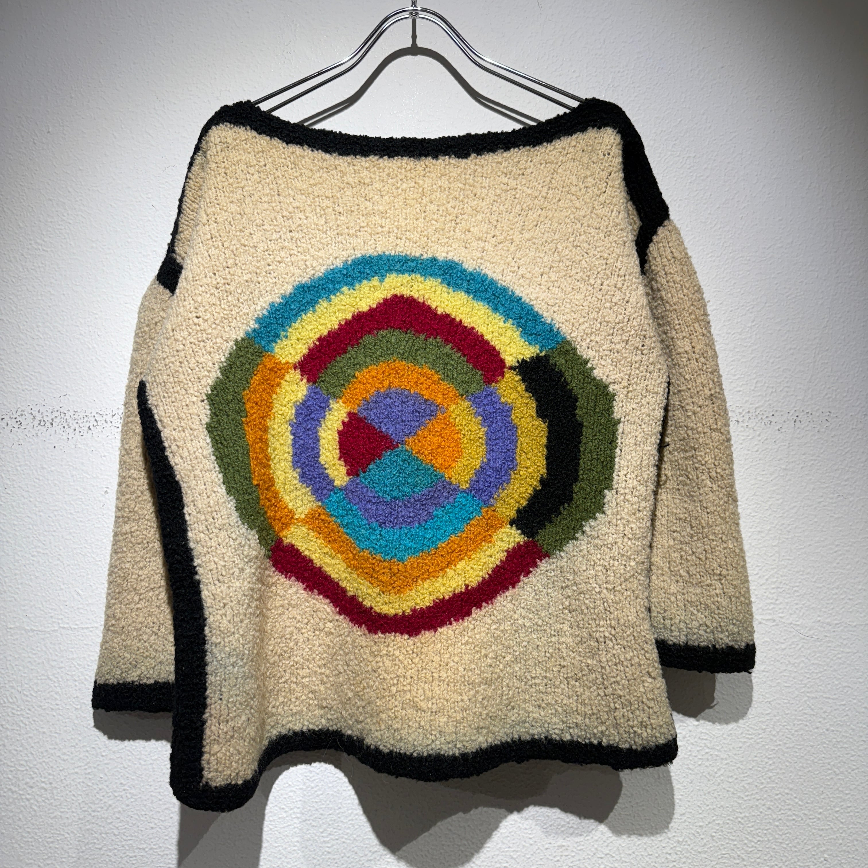 不思議な模様がフロントに大きく描かれたニット。