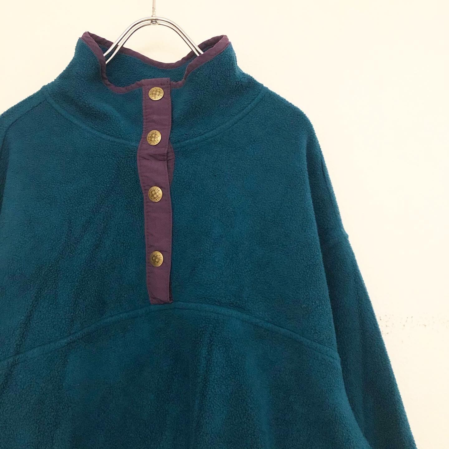 USA製ウールリッチのプルオーバーフリースです。グリーンカラーに紫色のパイピングと金ボタンが良く映えます。ダボっと程よい大きさで丸みを帯びたシルエット◎ アウトドアでの使用もお勧めです。