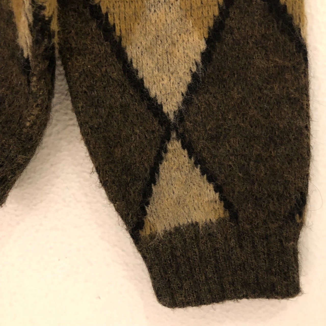 全面にアーガイル柄で渋めなカラーリングがスタイリングしやすい一枚です。