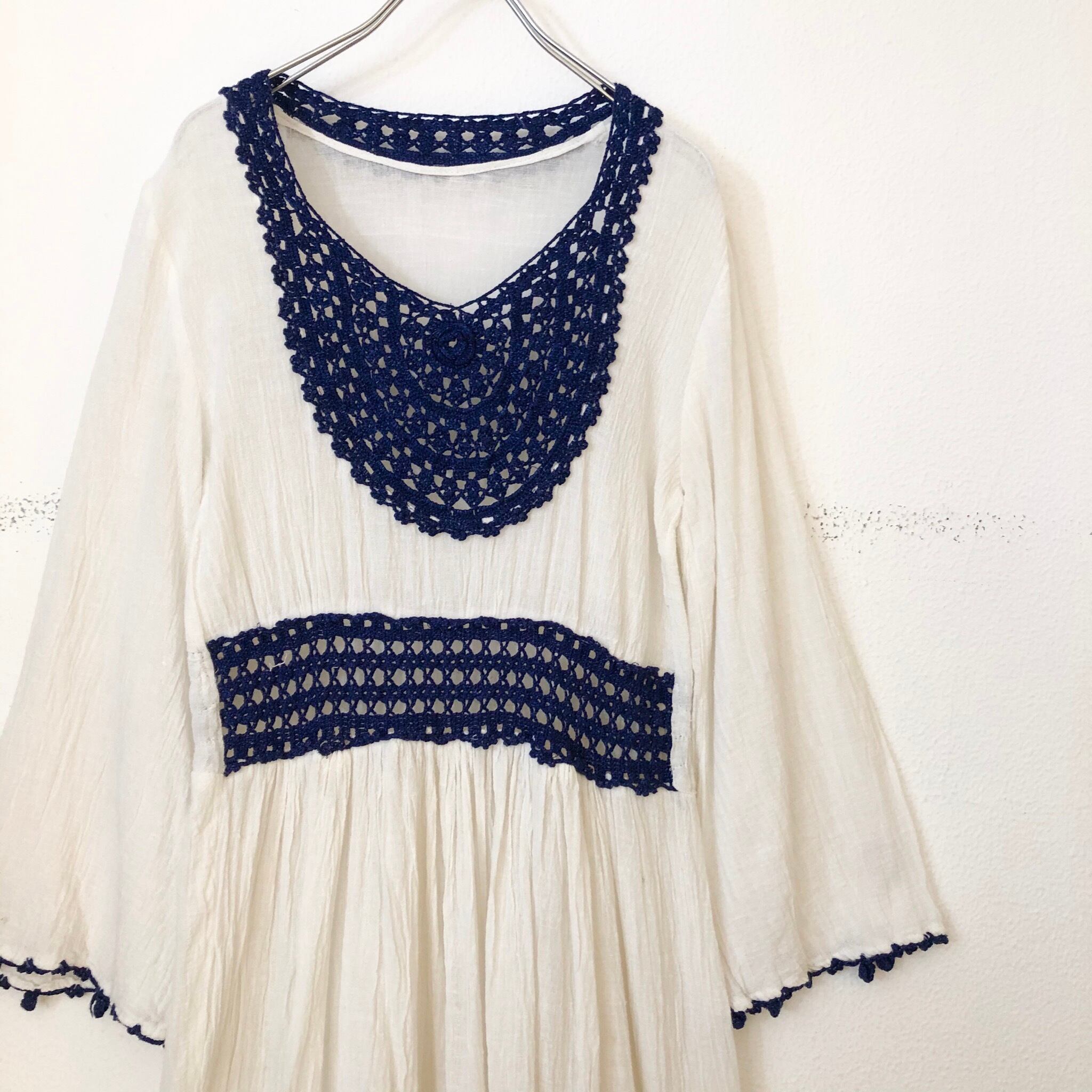 胸元とウエスト部分のかぎ編みレースがポイントのクロッシェワンピース。