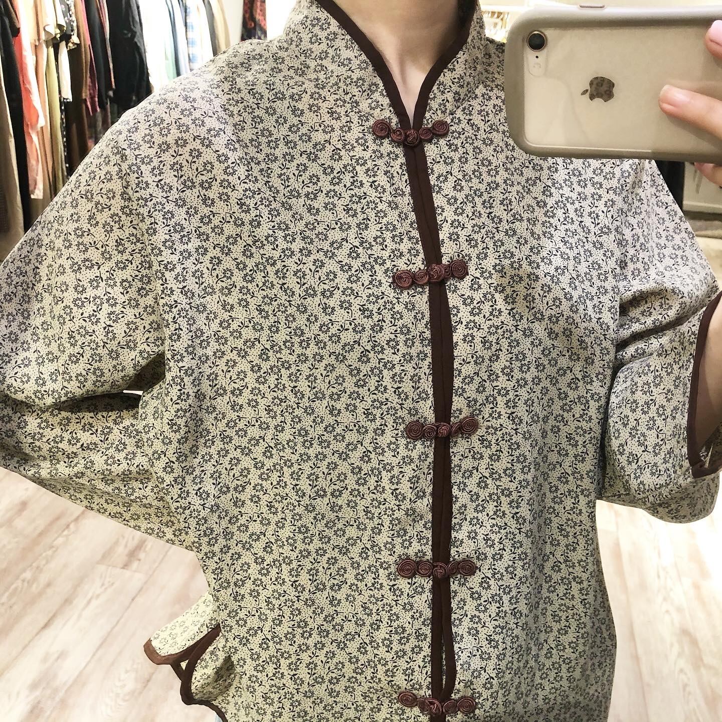 小花柄に茶色のパイピングが可愛いデザインシャツ。女性らしいデザインでこちらはチャイナシャツに抵抗ある方でもブラウス感覚で着て頂けるかと思います。