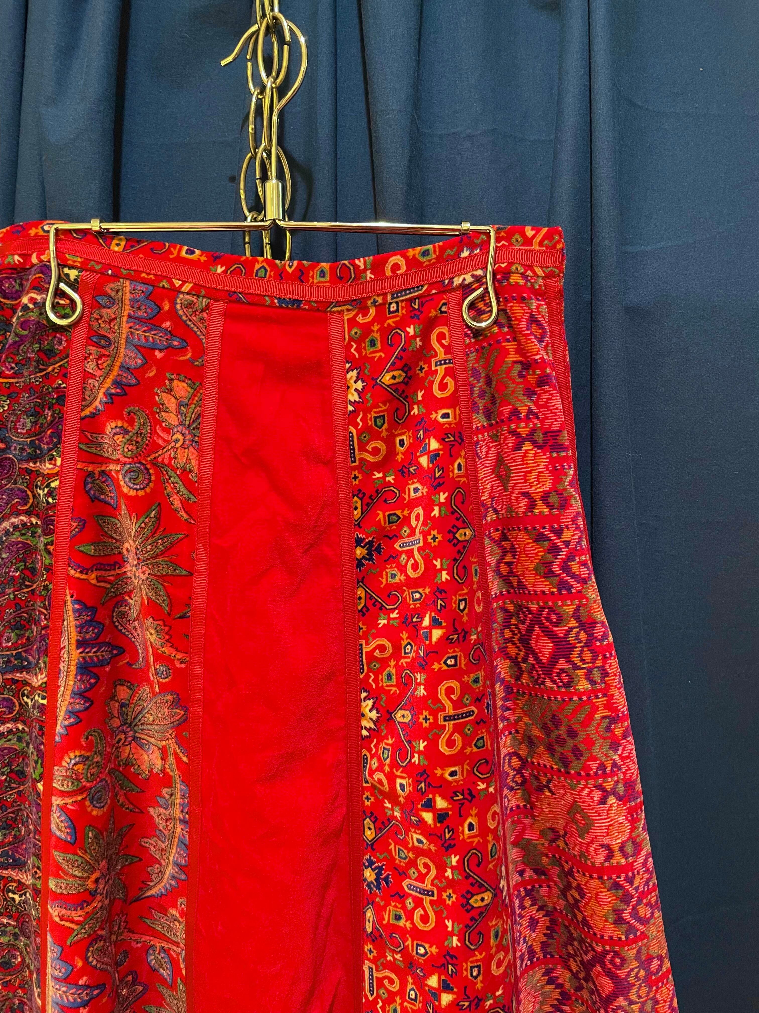 柄の違った生地をふんだんに使い、合わせ部分には赤のテープが縫い合わさった手の込んだ1着。