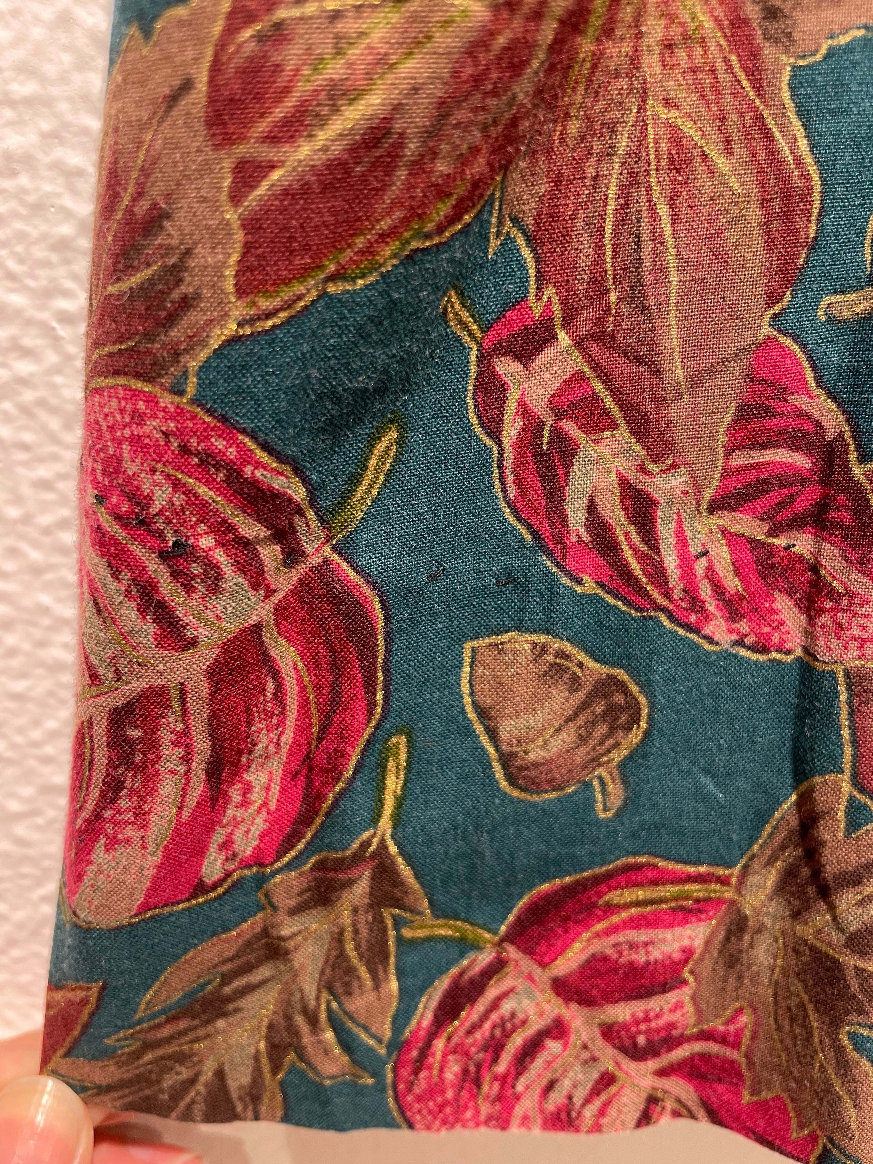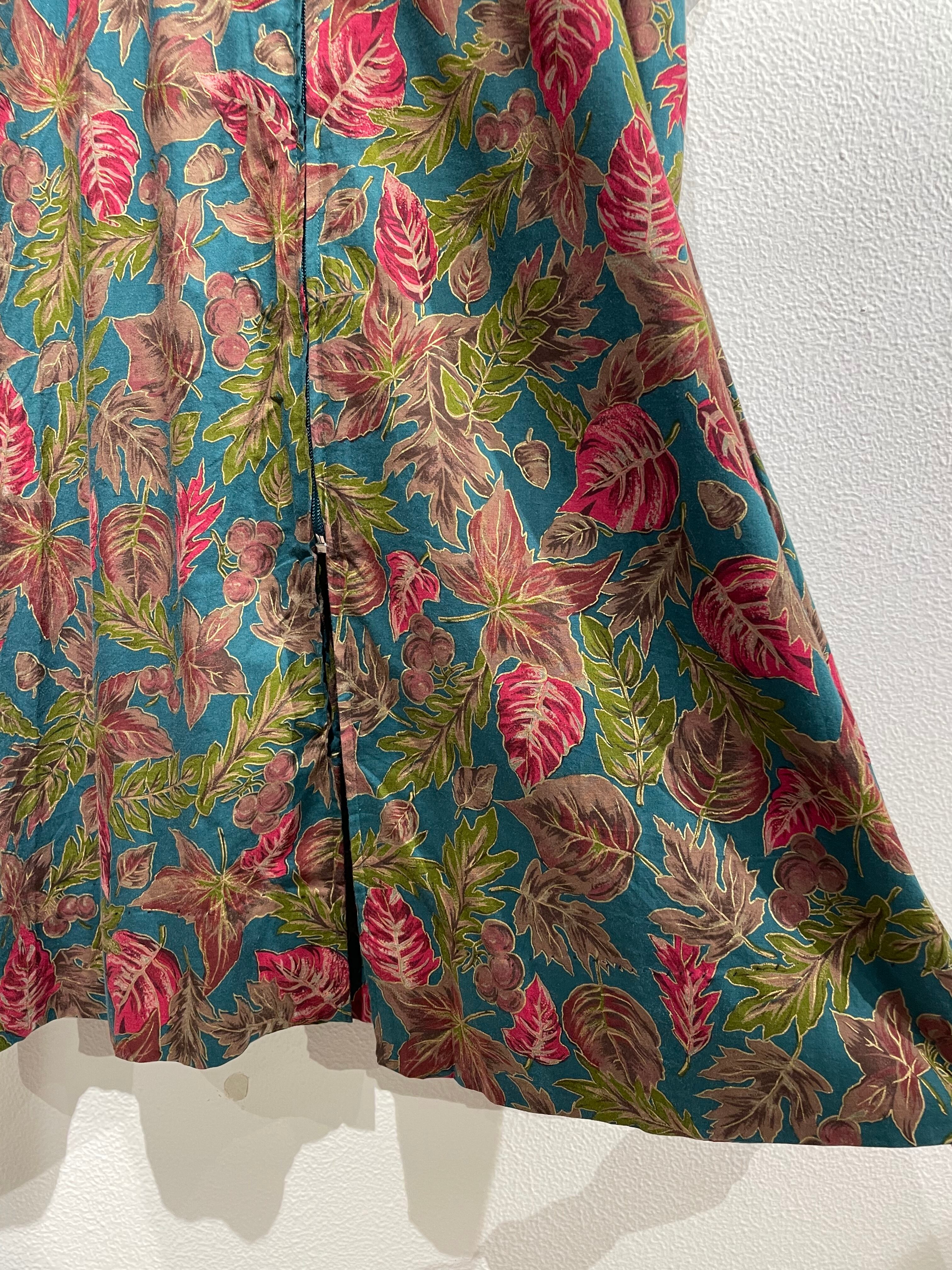 落ち葉柄のワンピース。スタンドカラーにロングのAラインシルエットが民族衣装のような雰囲気。