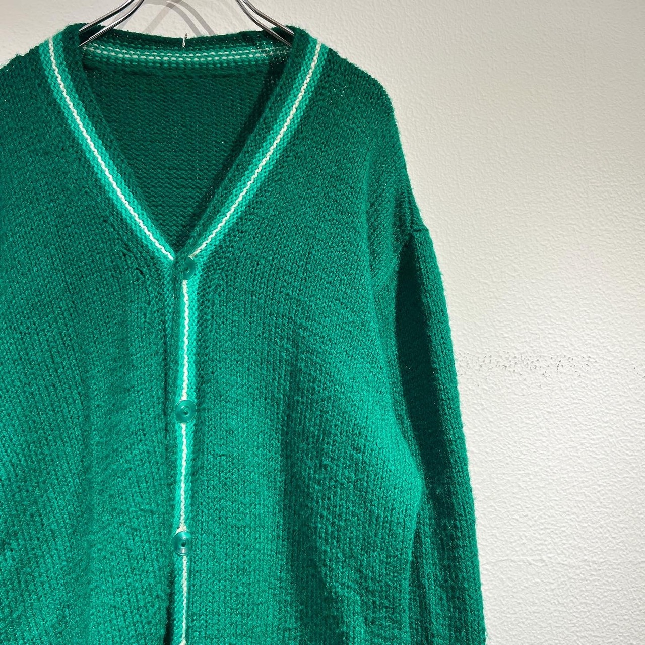 はっきりとしたグリーンのカーディガン。