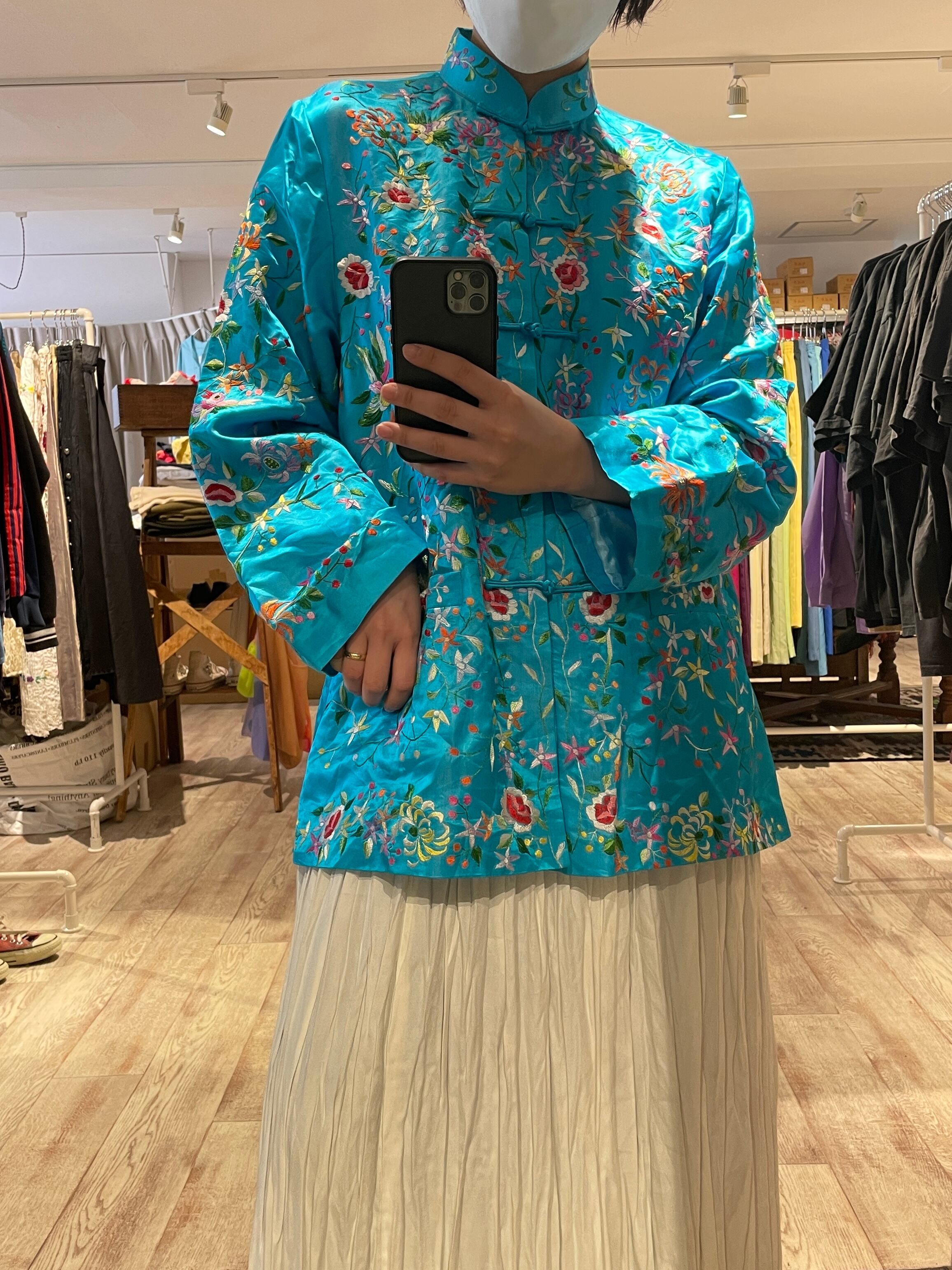爽やかなブルーにカラフルな刺繍たっぷりのチャイナジャケットです。