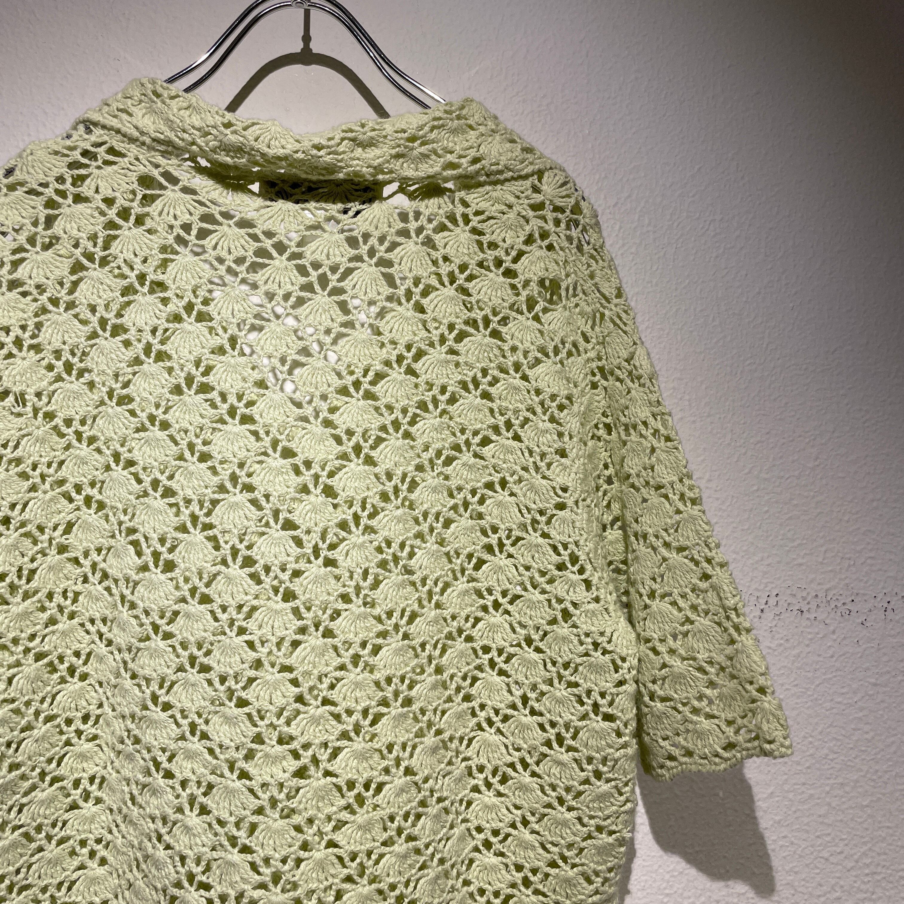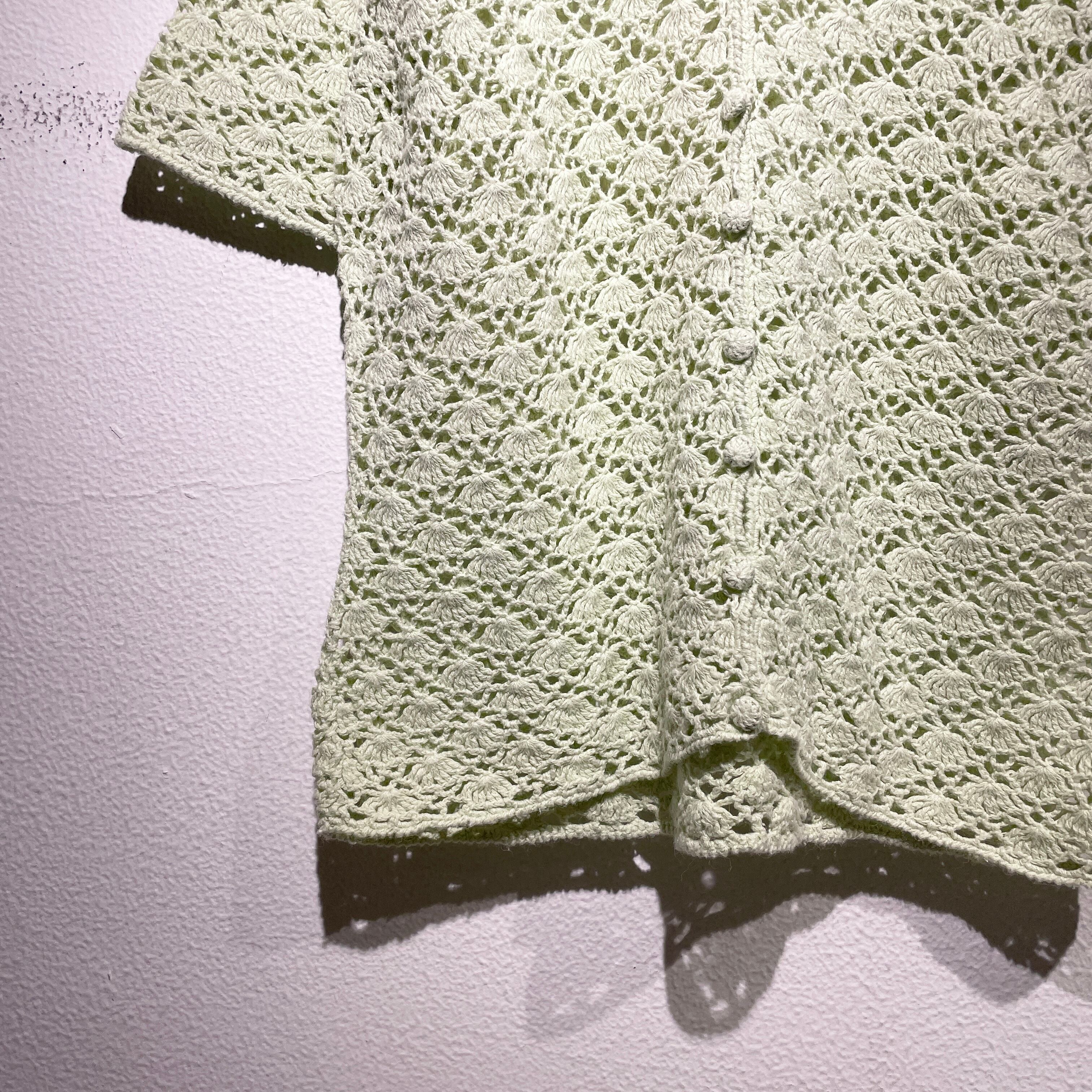 淡いグリーンが可愛い手編みのクロシェカーディガンです。