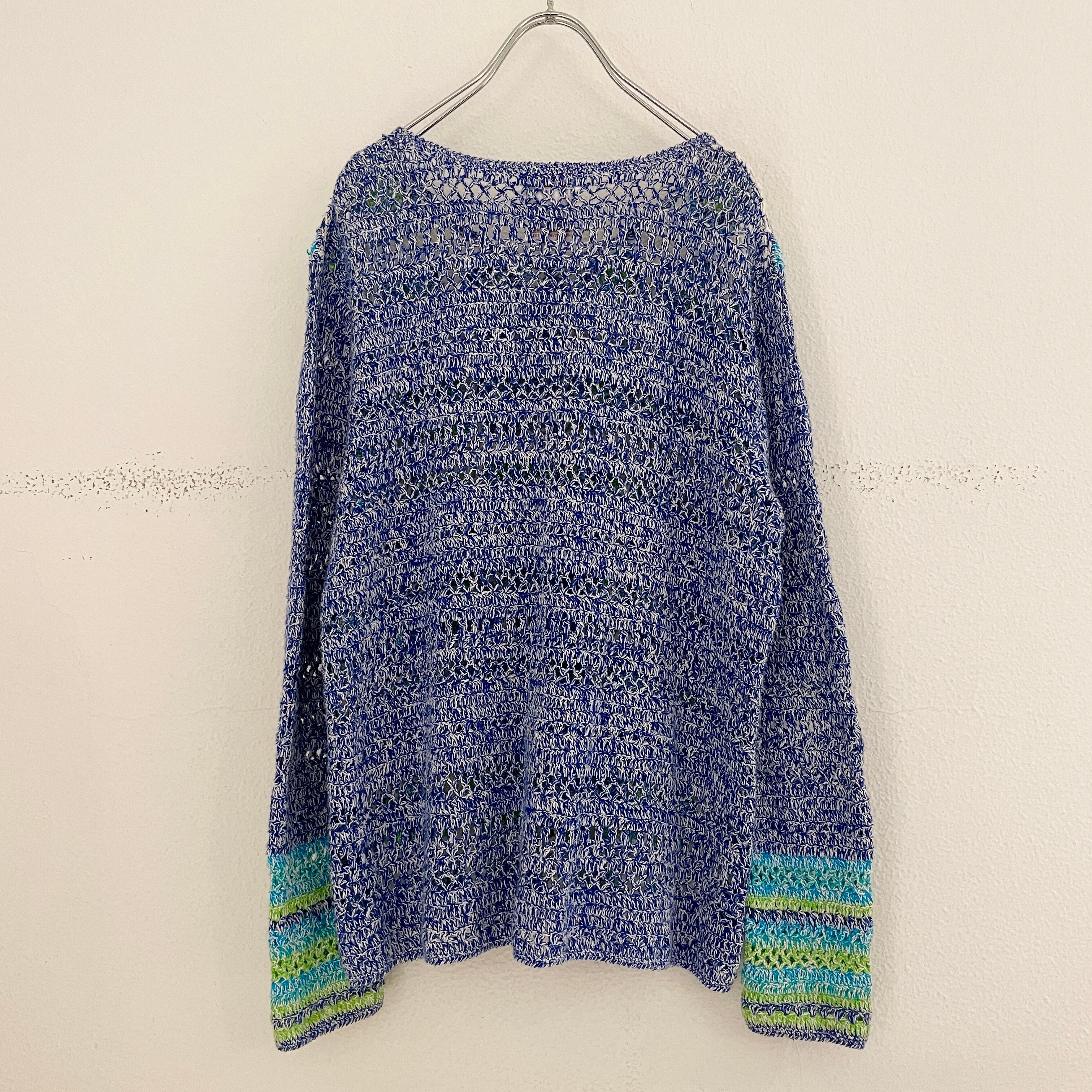 長袖ではありますが、ざっくりとした編みと、コットンリネンの素材が夏にもお使いいただける一枚です。