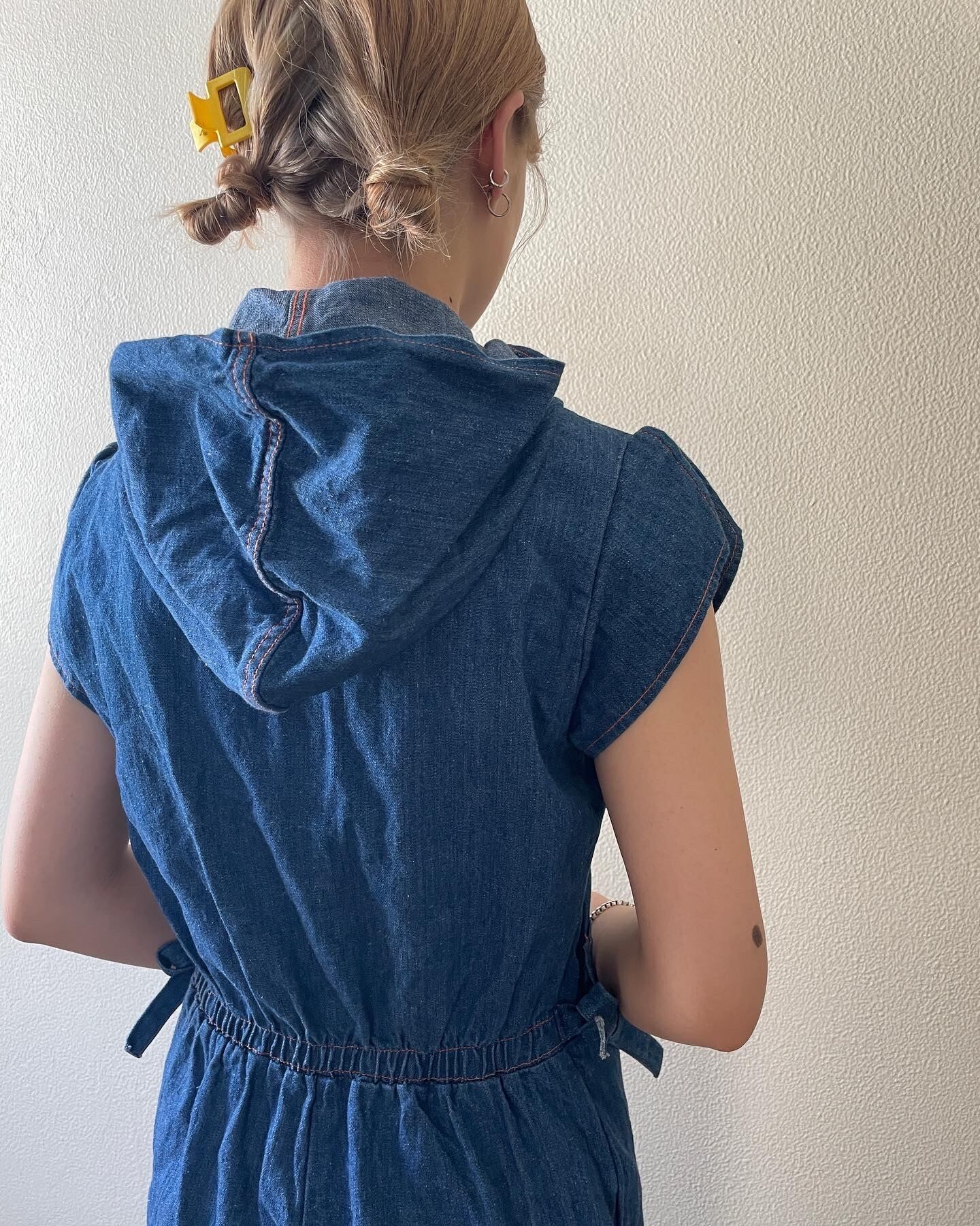 フレアシルエットのボトムとフード付きのキュートな1着。