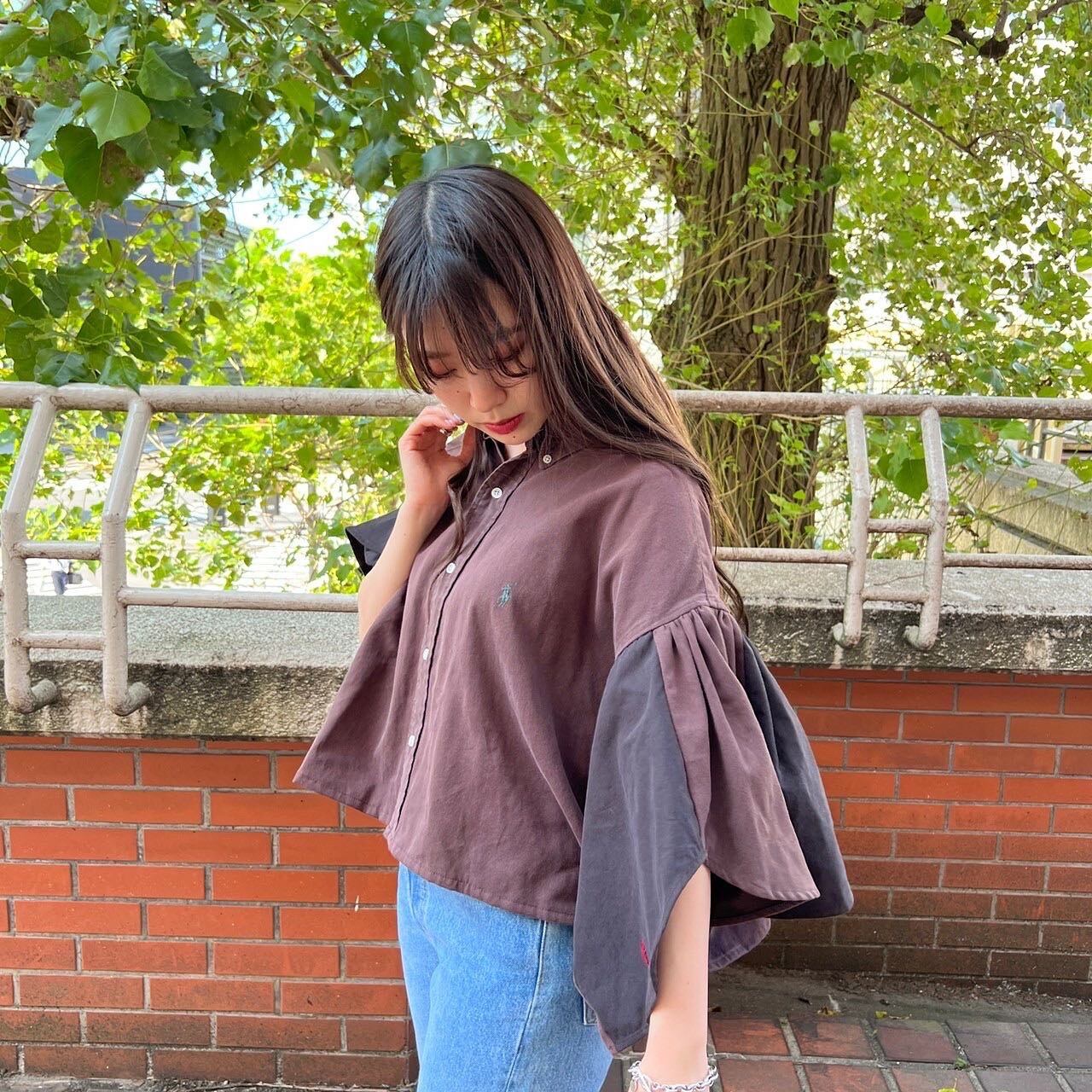 今回はお袖にこだわり、usedのラルフシャツを2枚贅沢に使用し、ギャザーをたっぷりと付けることによって、お袖のボリュームがより一層際立つ作りにいたしました。