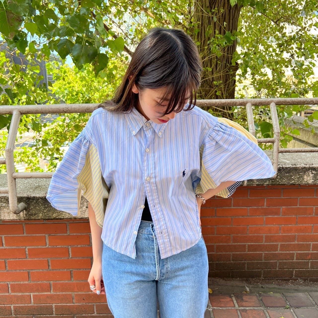 今回はお袖にこだわり、usedのラルフシャツを2枚贅沢に使用し、ギャザーをたっぷりと付けることによって、お袖のボリュームがより一層際立つ作りにいたしました。