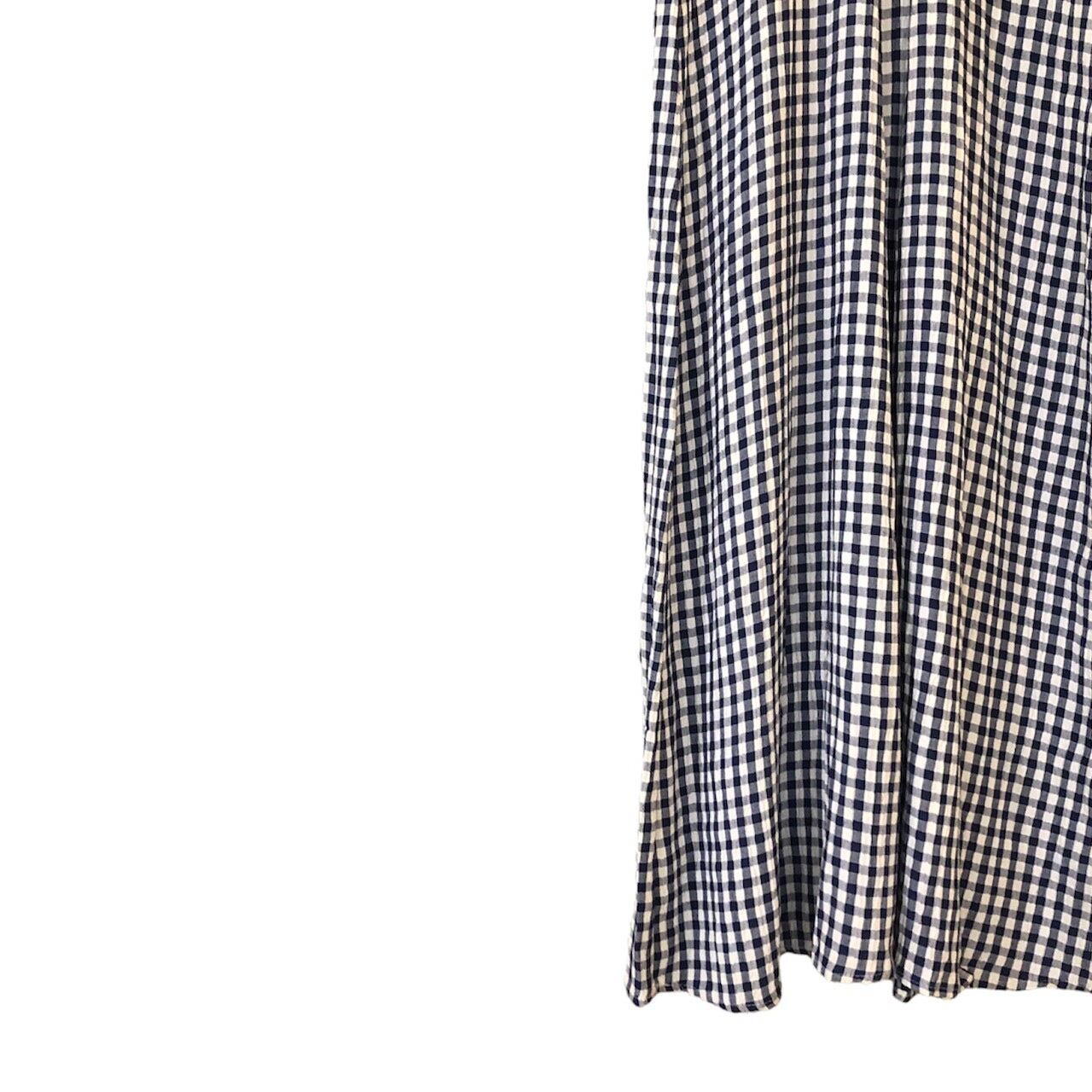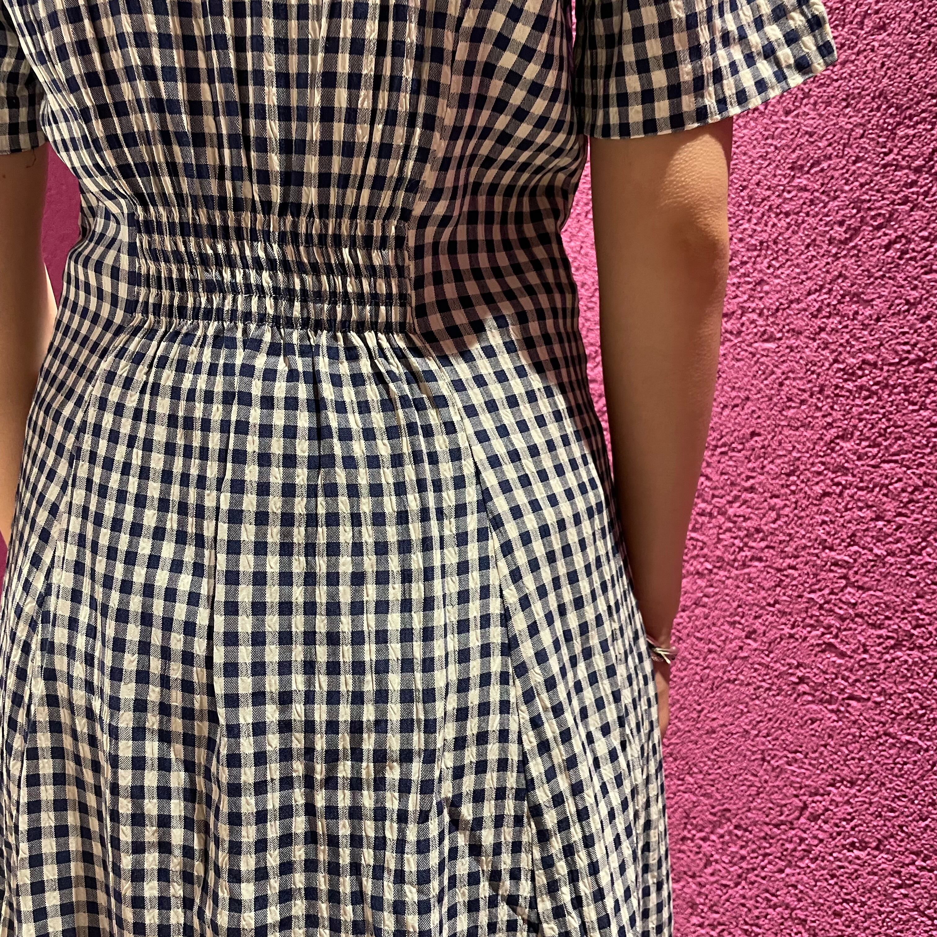 小さなリボンがかわいいギンガムチェックワンピース。リボンは若干の調節が可能。後ろは一部分のみゴム付きとなっております。ふんわりと広がるスカート部分も素敵です。
