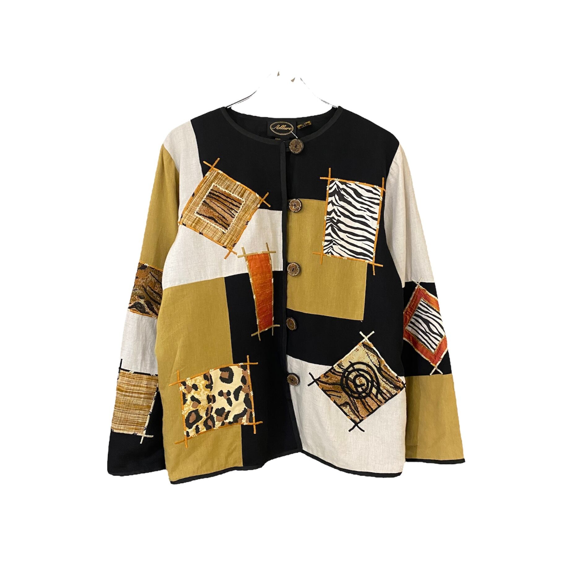 デザイン性の高いパッチワークジャケット。