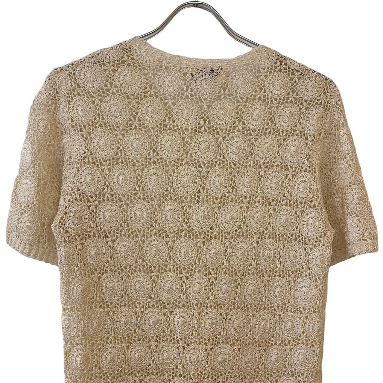 ショートスリーブのクロシェニットカーディガンです。半袖なので、キャミソールなどの上からさらっと着ていただけます。肌なじみのいいアイボリーカラーとシンプルなデザインが着回し抜群です!