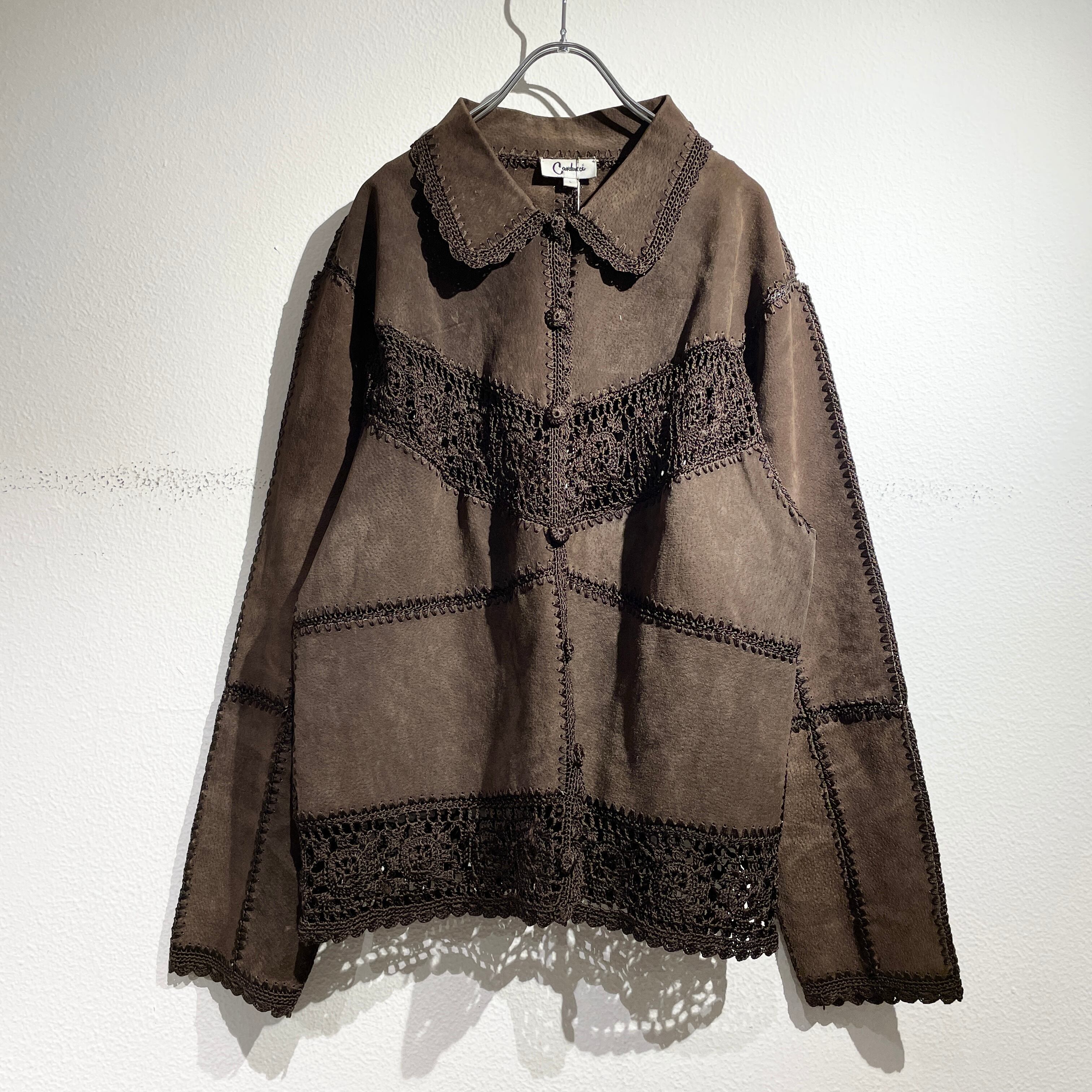 胸元と裾のレース編みとスエードの甘辛なデザインが可愛らしい一枚。