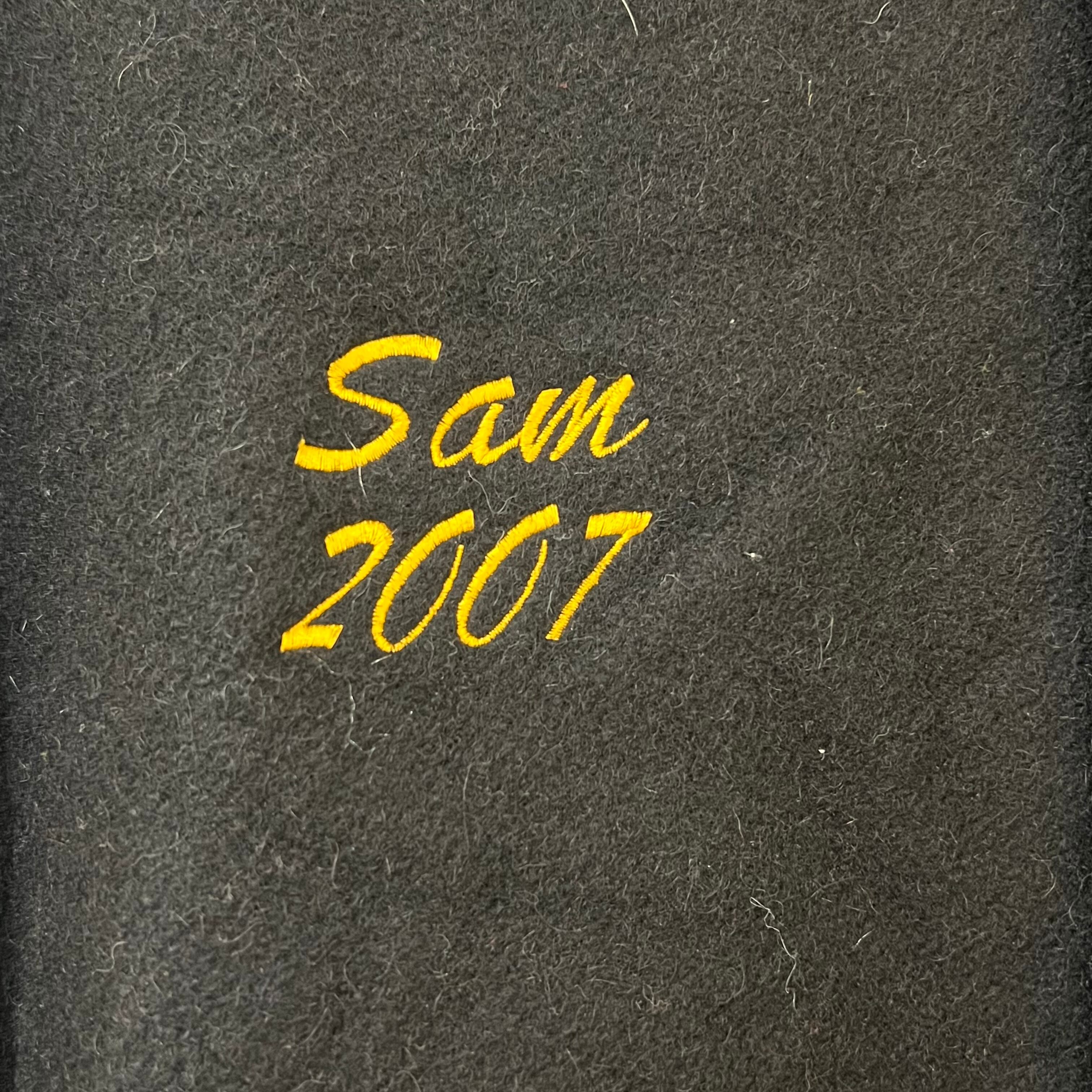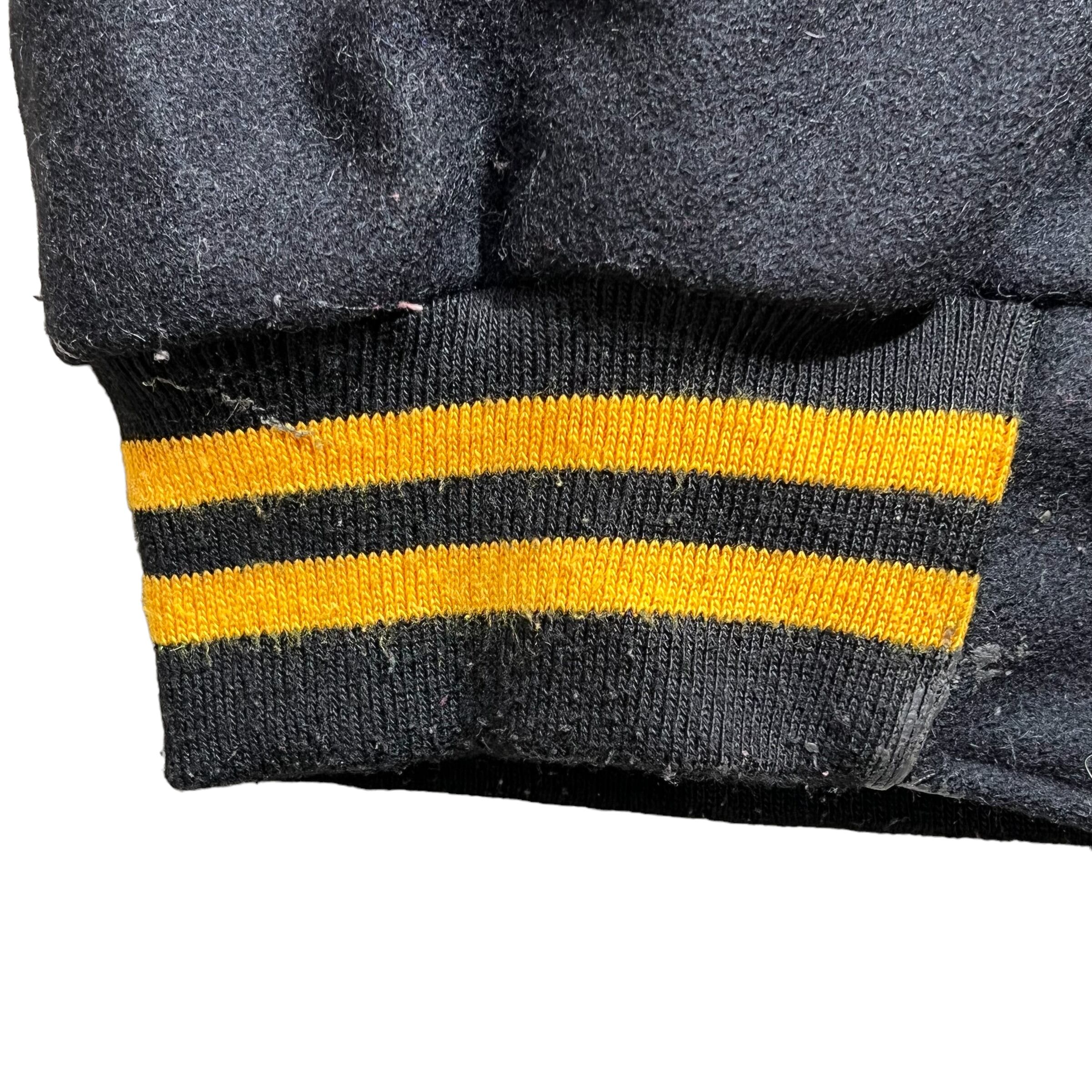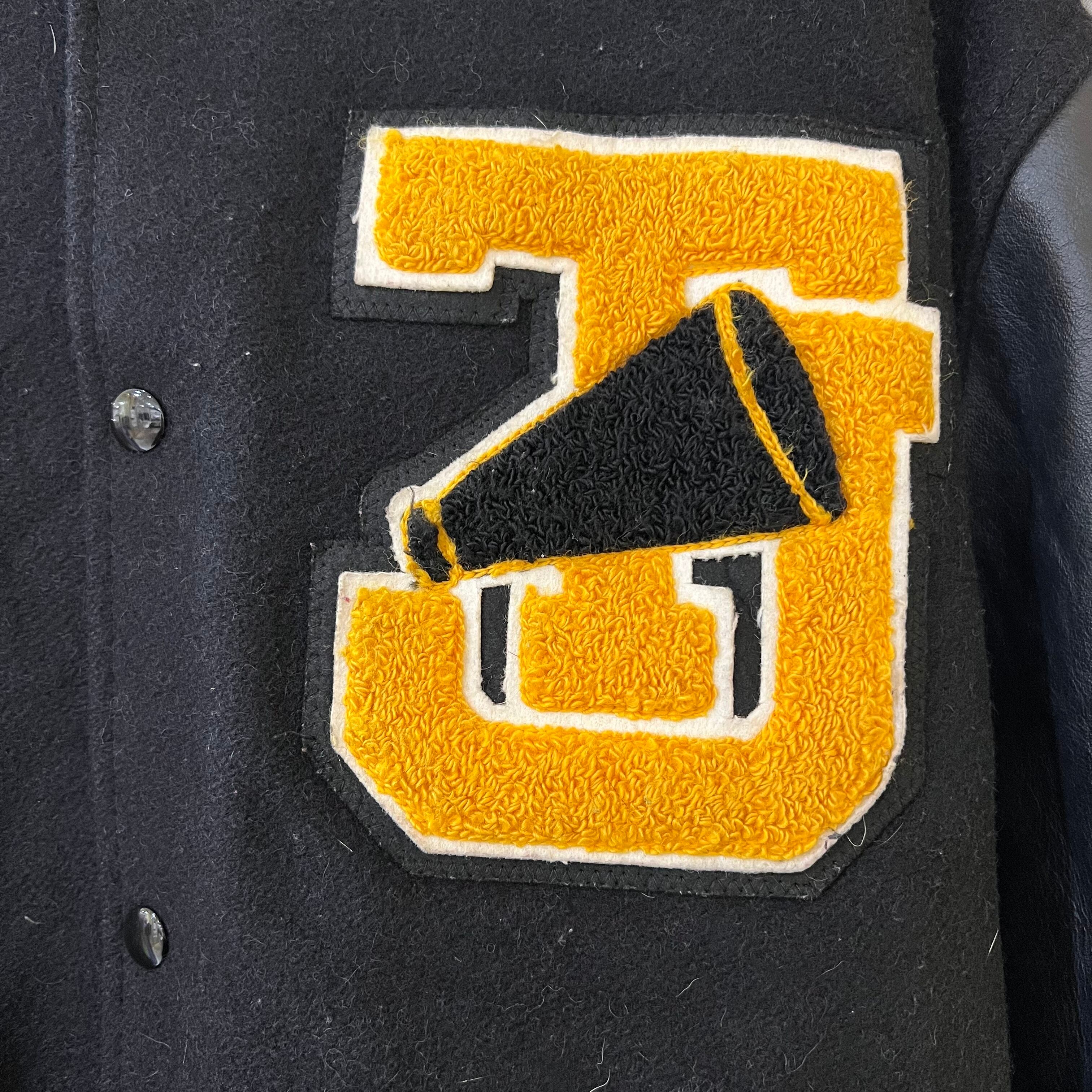 チアリーディングチームのスタジャンで、フロントや袖にあるメガホンのワッペン刺繍が可愛らしいです。