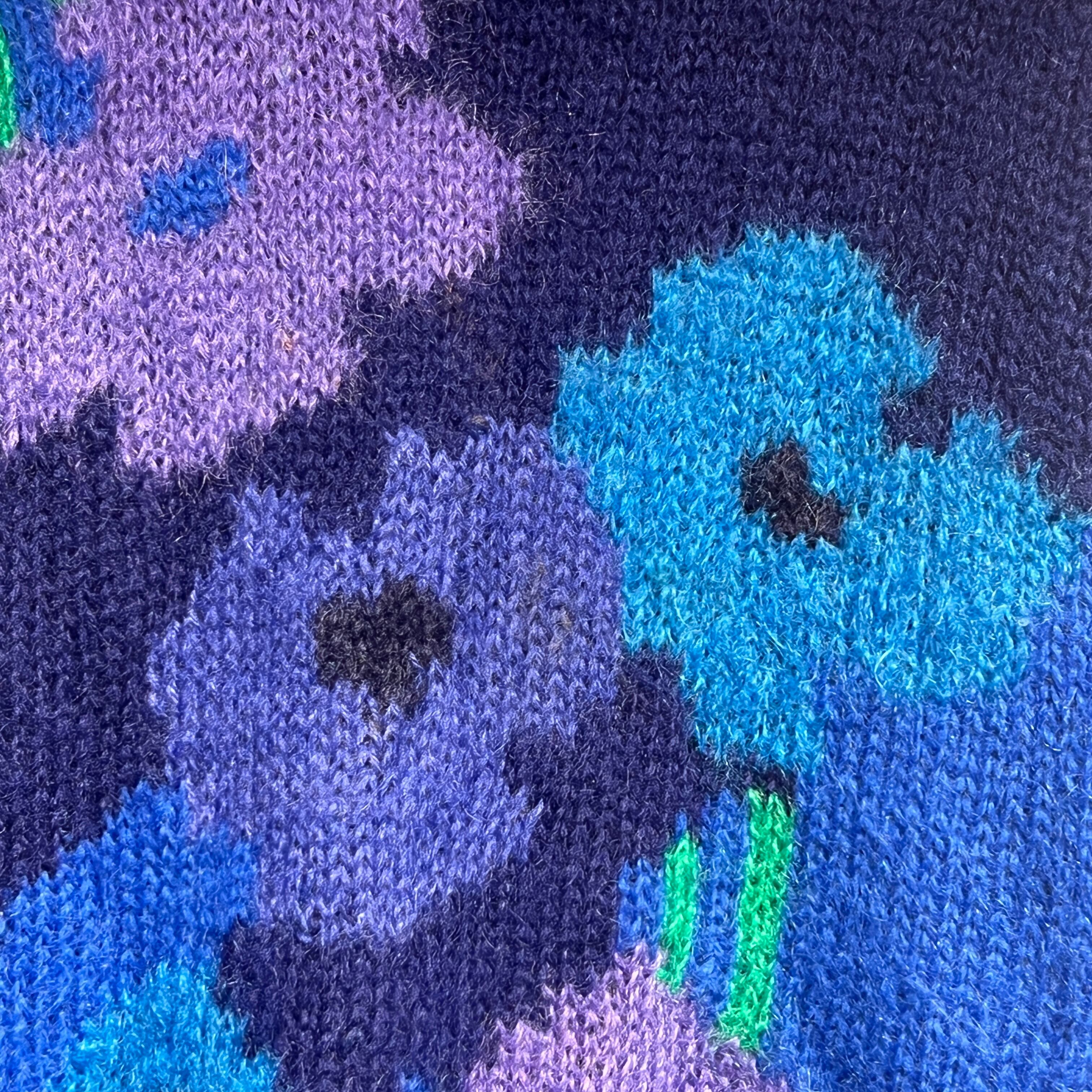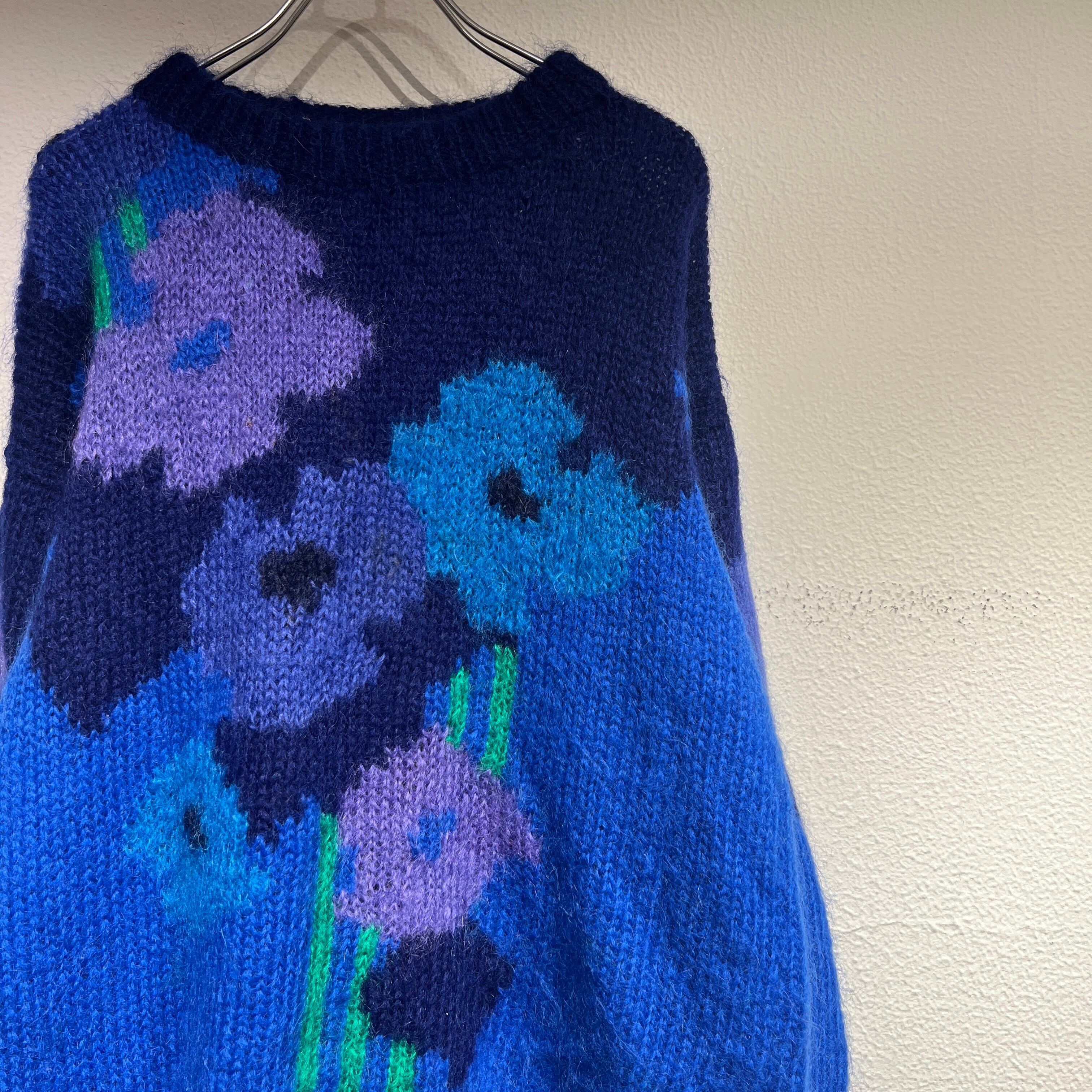 前後両面に描かれたお花模様が可愛らしいモヘアニット。