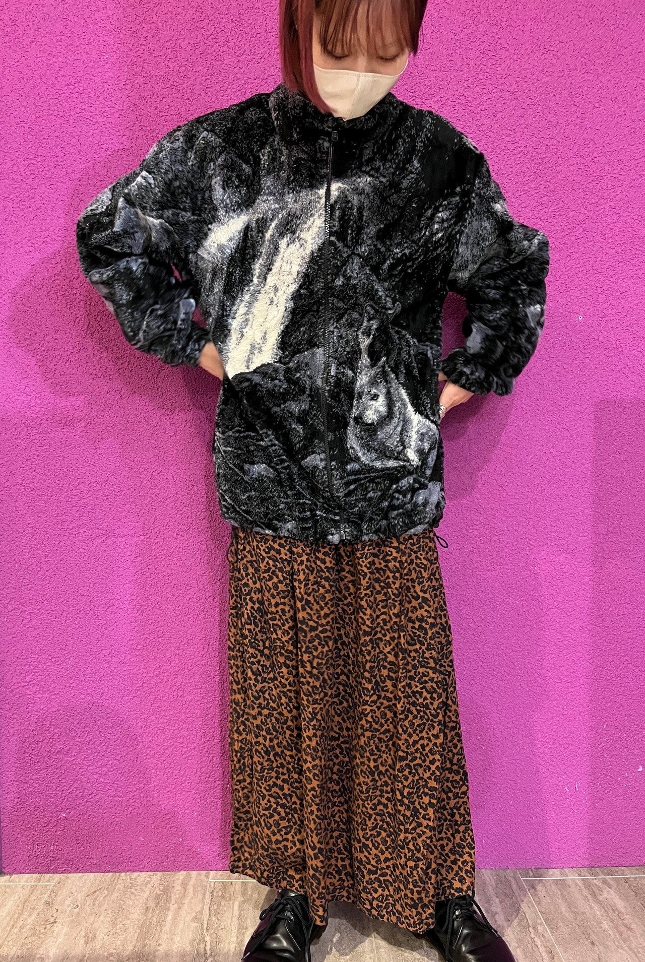 全体にプリントされた滝とオオカミのイラストが目をひくフリース☺︎