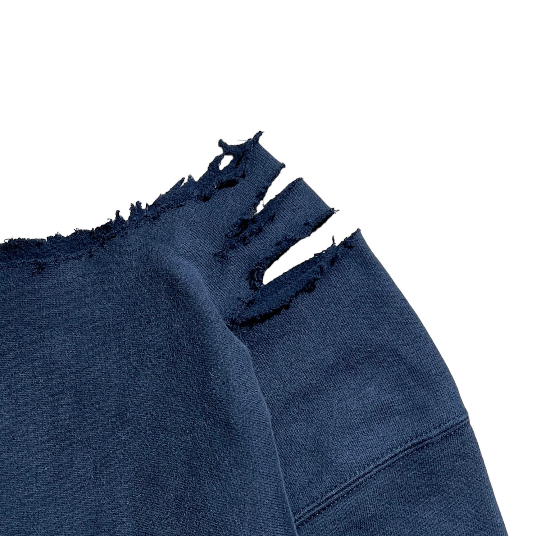 襟元がざっくりと切られたデザインのダメージスウェット。