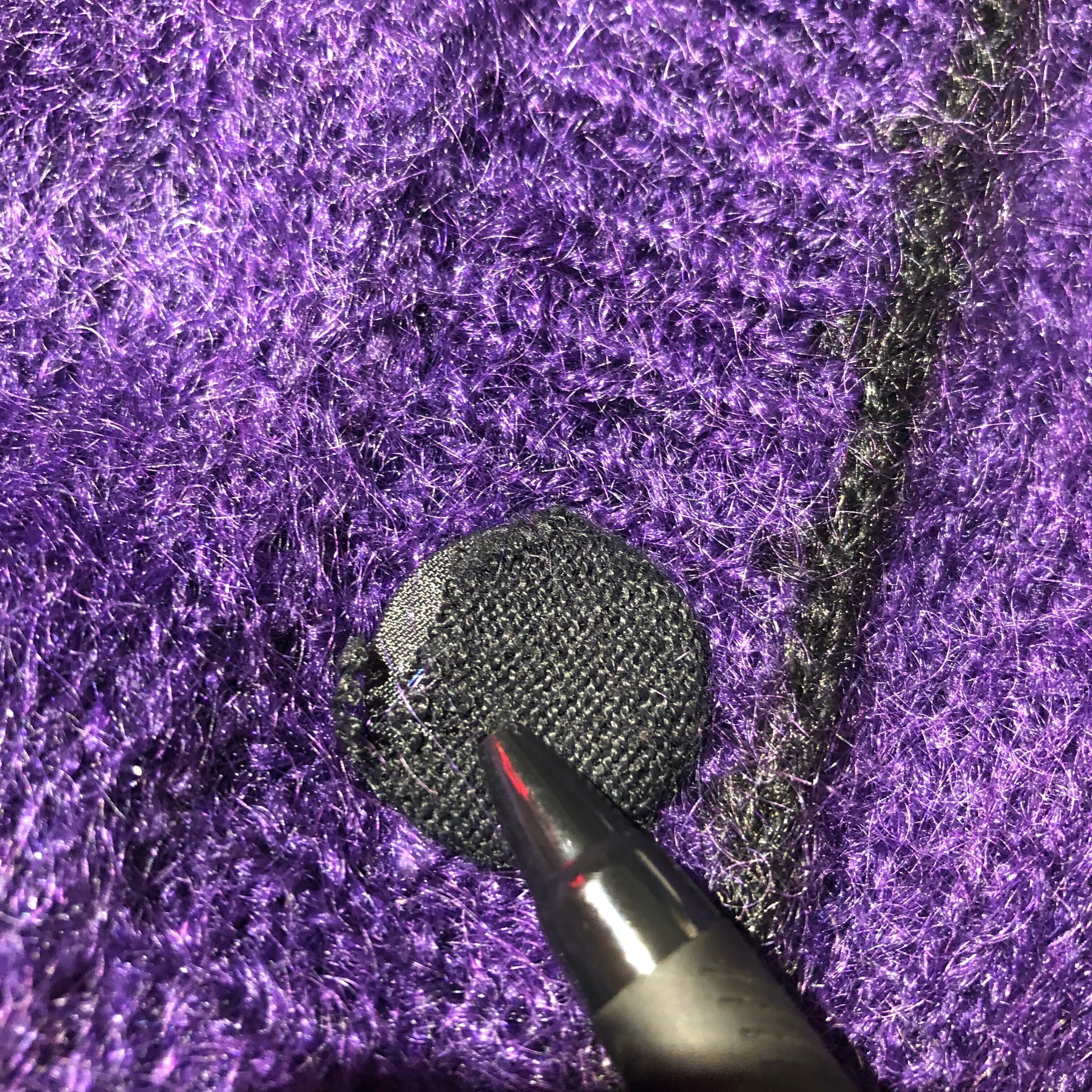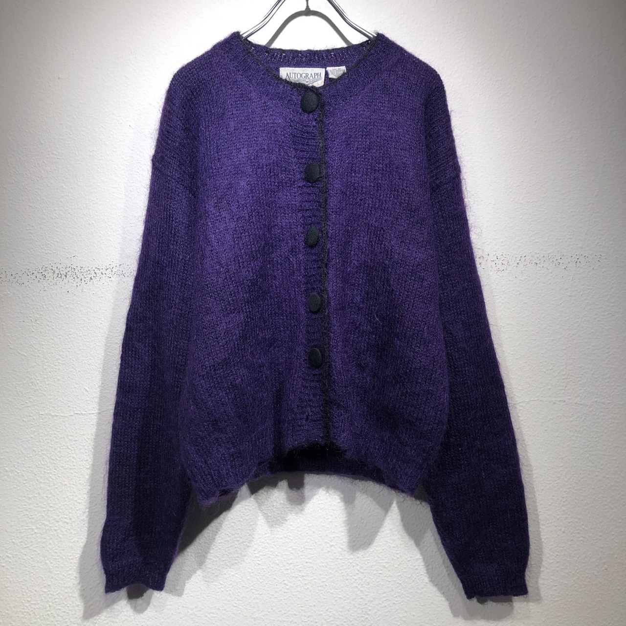 パープルにブラックのラインがシックな印象のニットカーディガン。