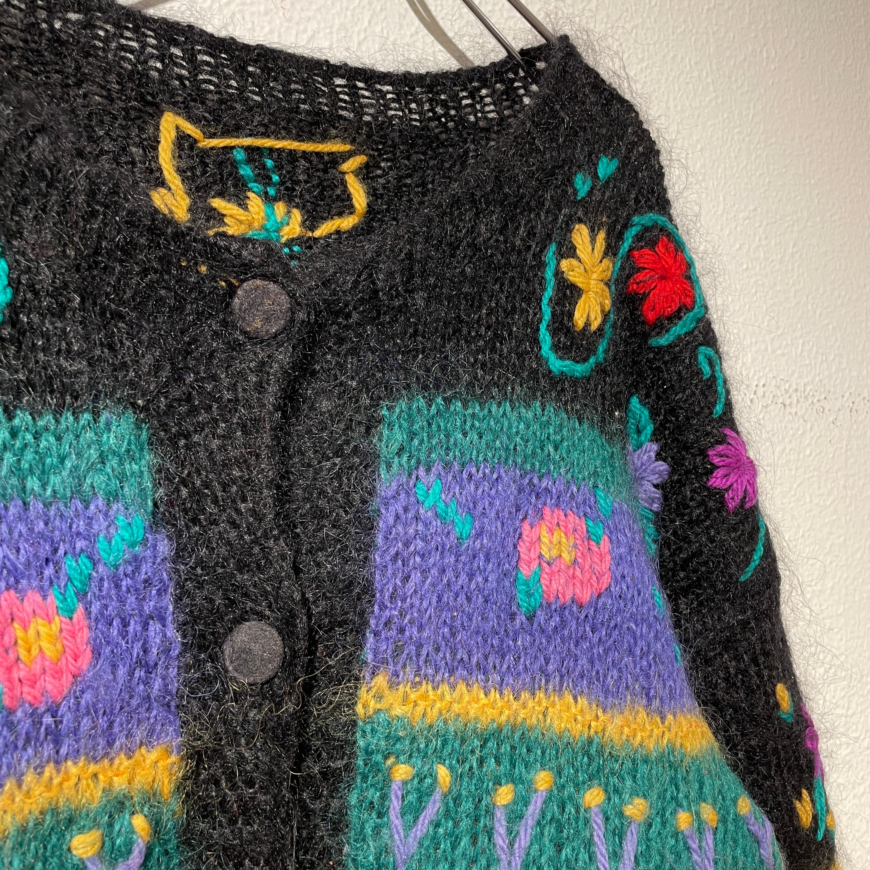 ハンドニットにより品質表示はございませんが、恐らくモヘア混。毛足長めの質感がとても可愛らしい。