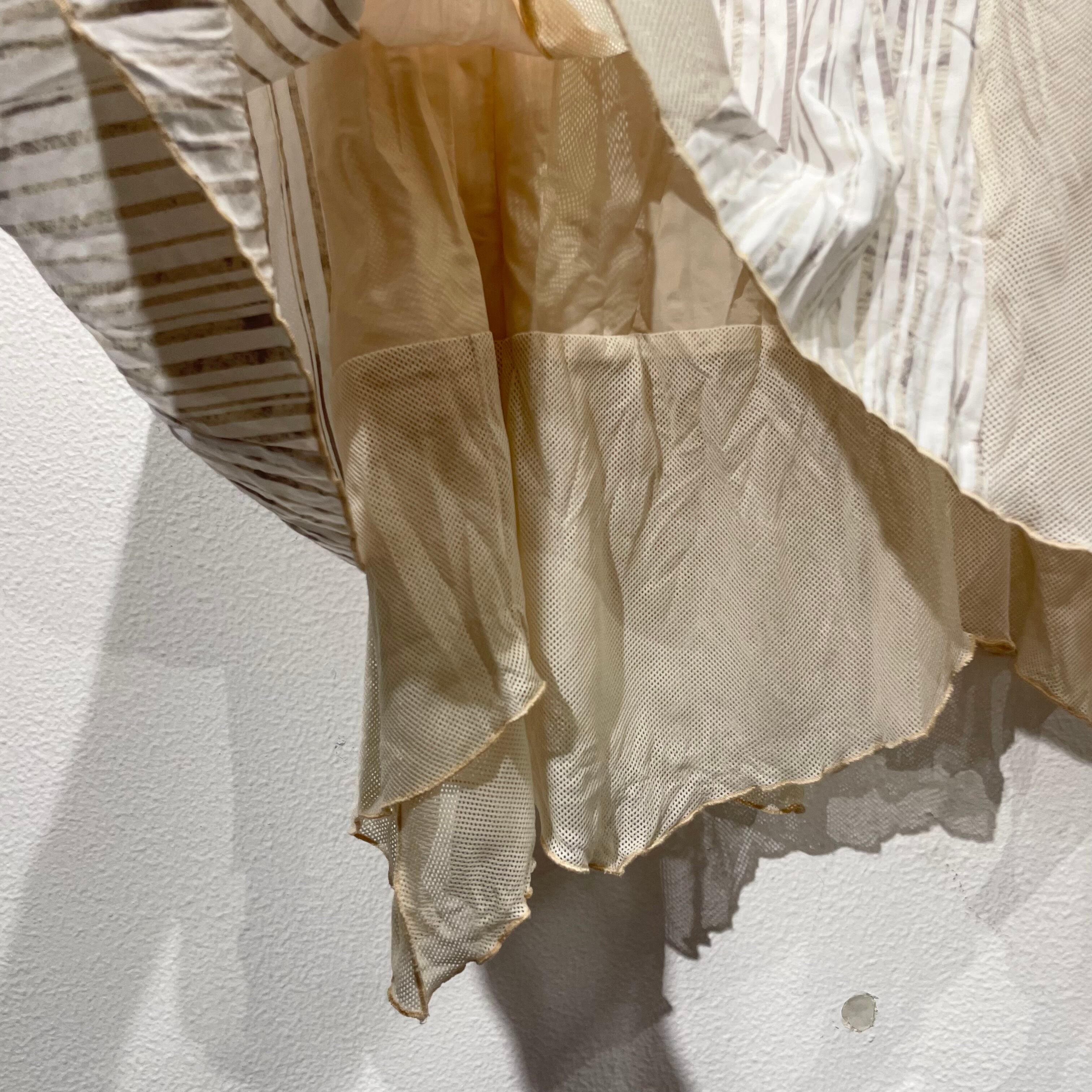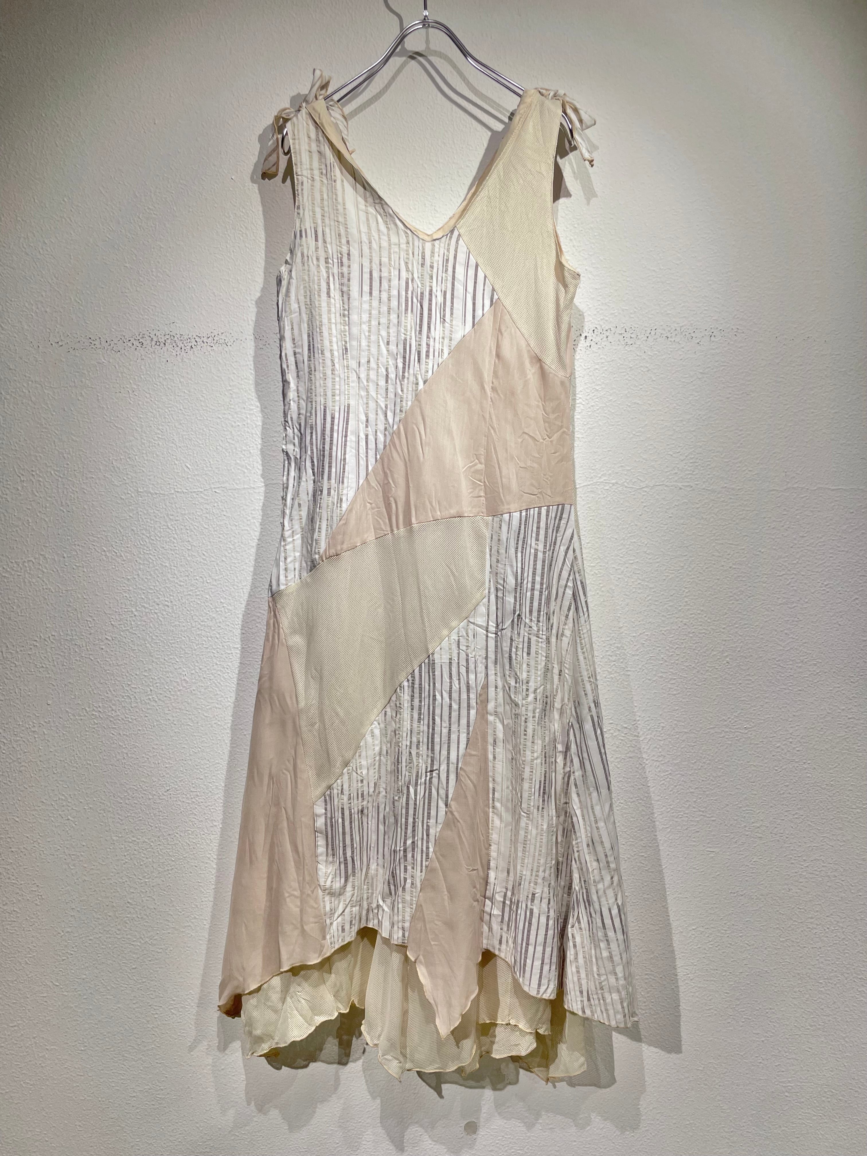 メッシュ生地を合わせたパッチワークや肩のリボン、裾のデザインが効いた1枚。