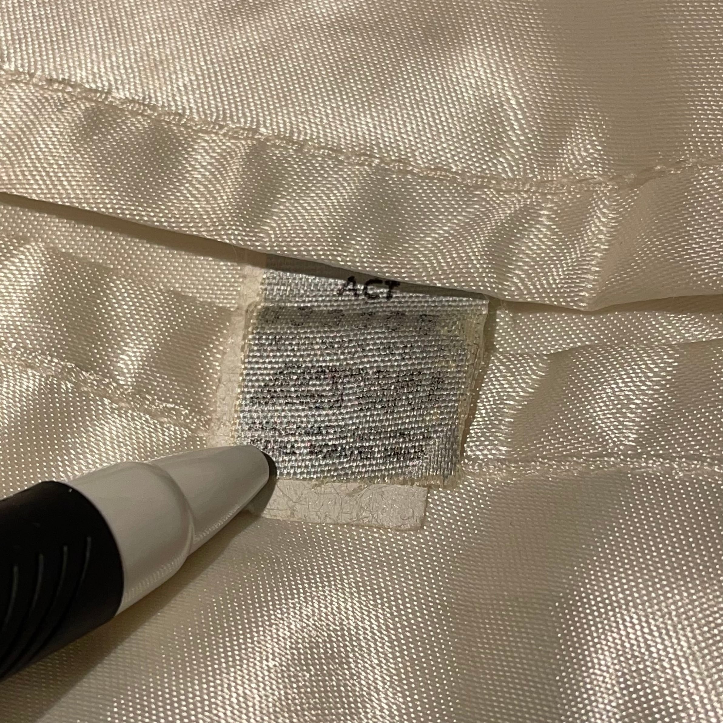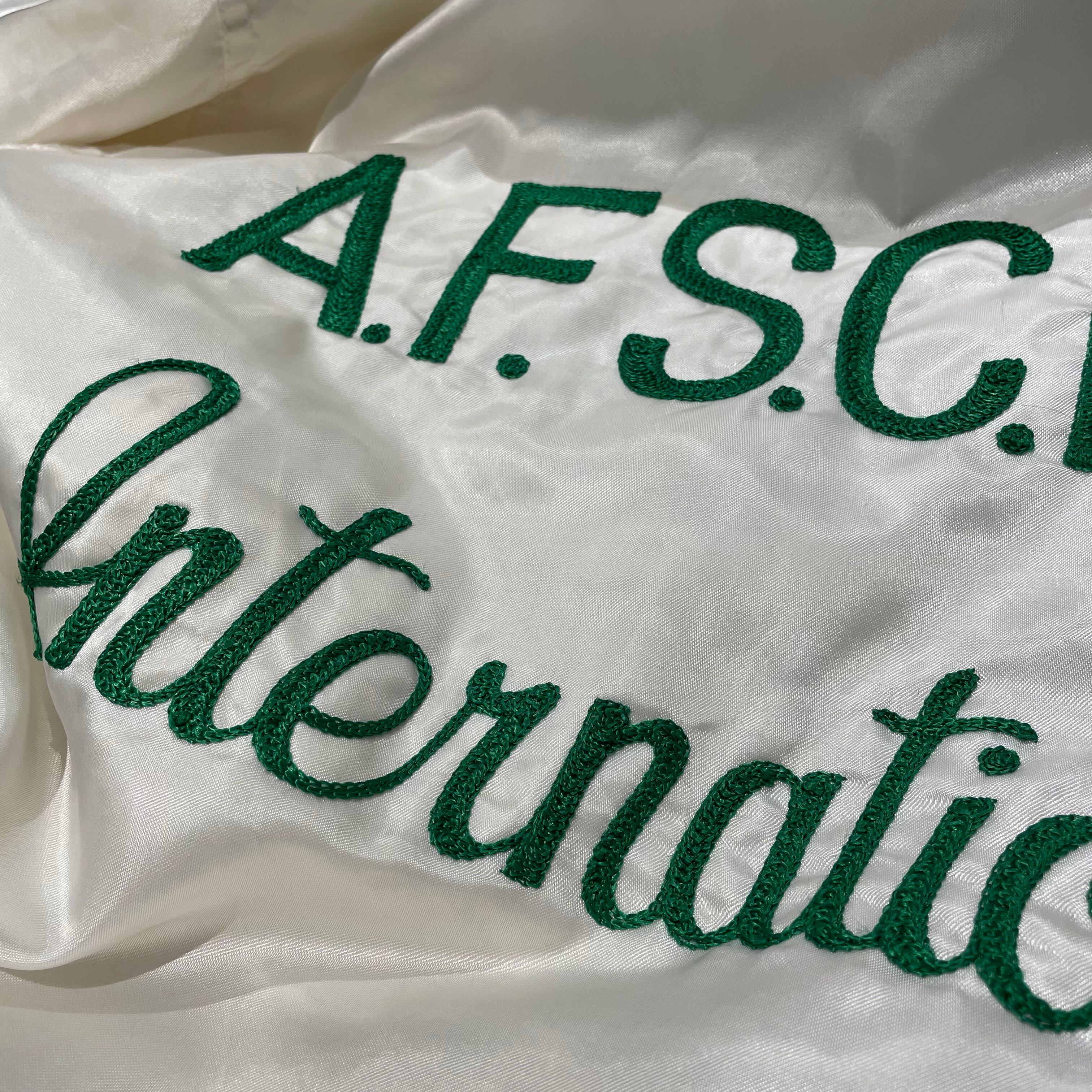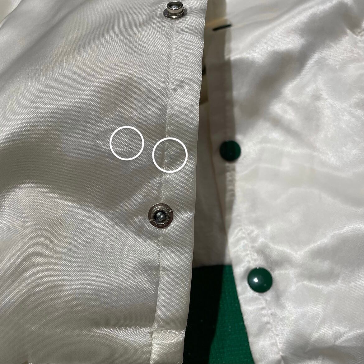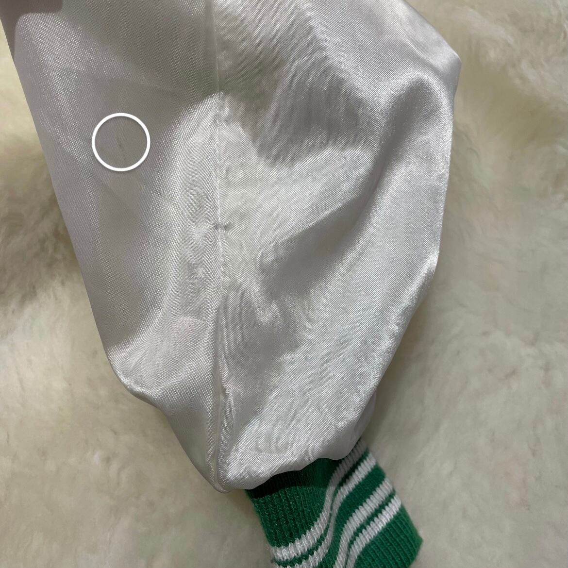 白ボディのサテン生地にグリーンのチェーンステッチがオールドならではのアイテム◎