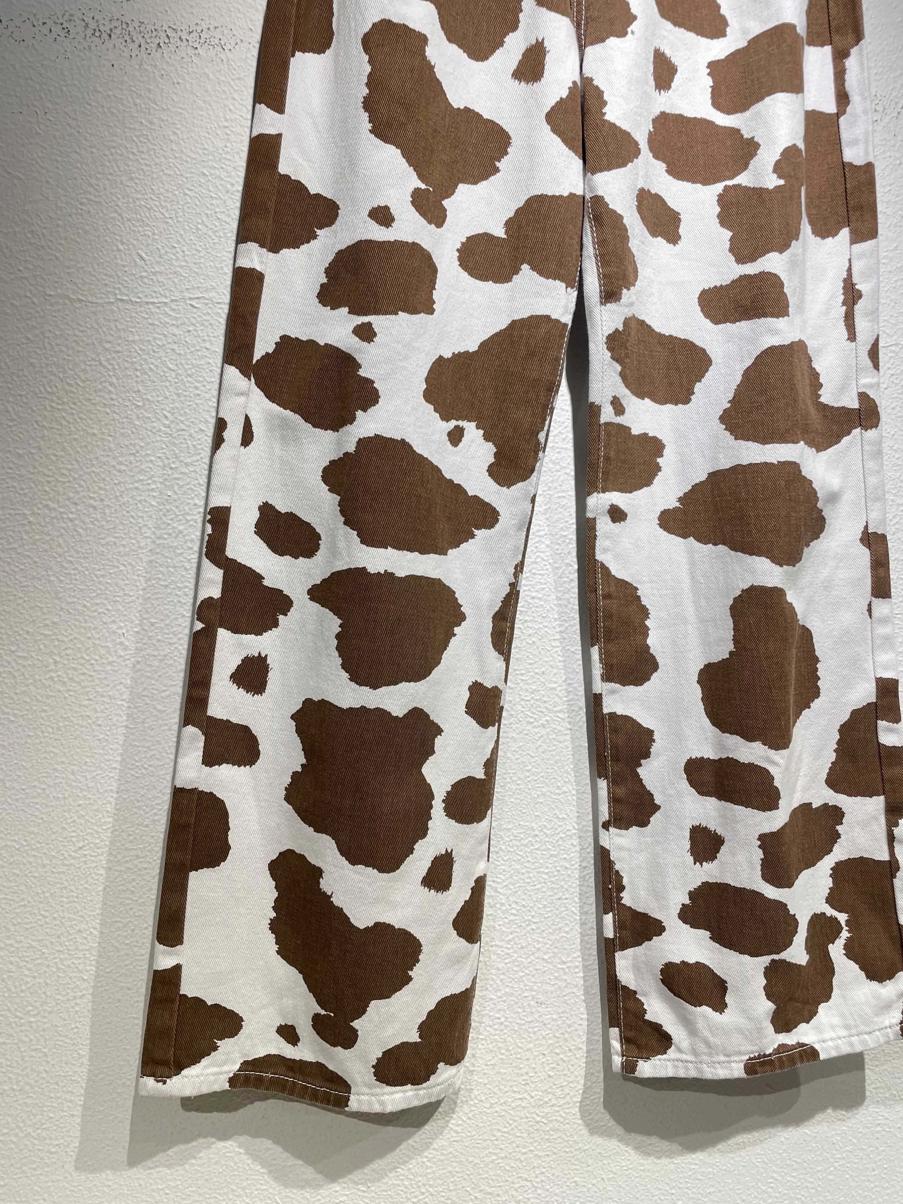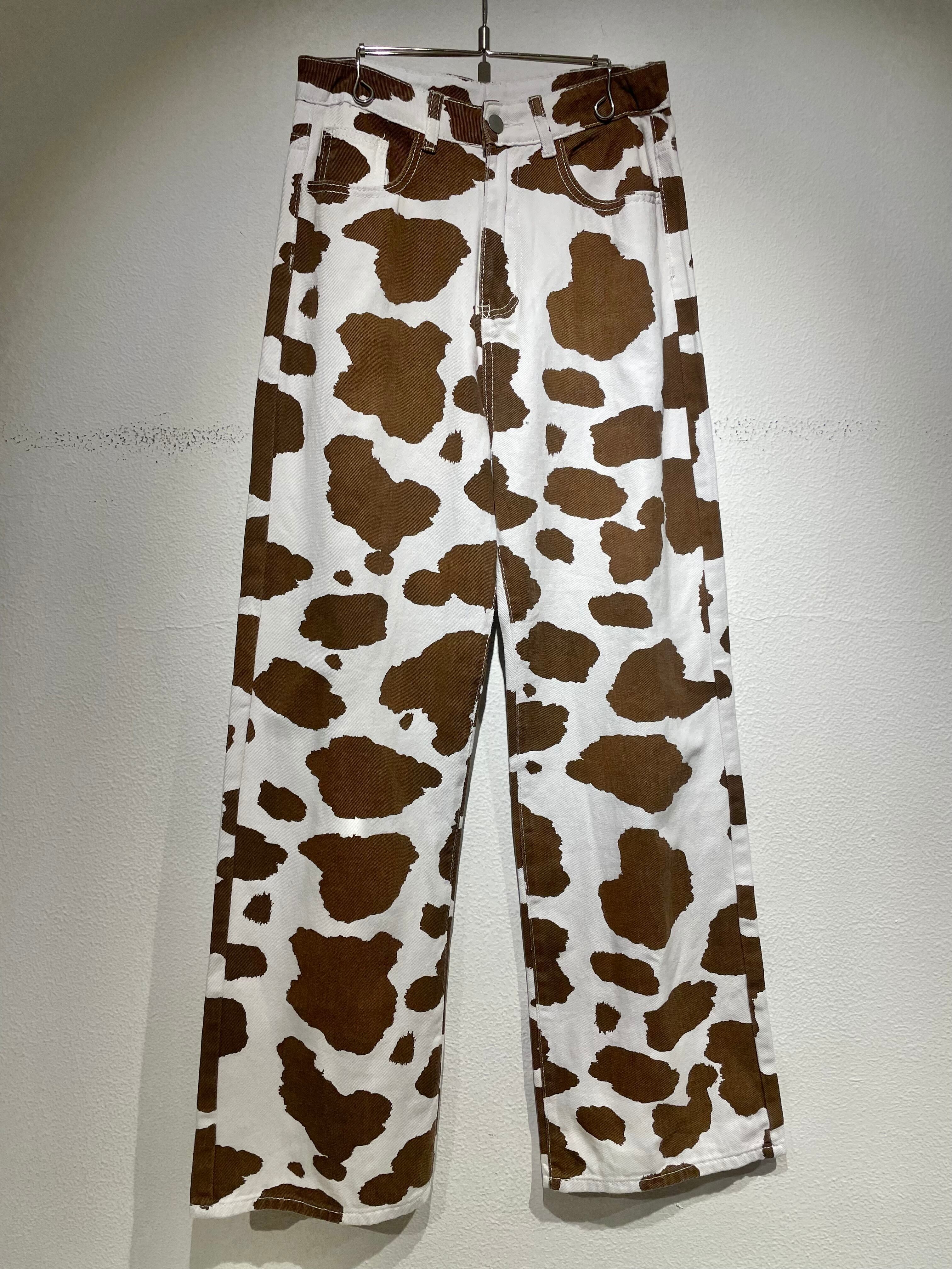 ブラウンとホワイトの牛柄が目を引くパンツです。
