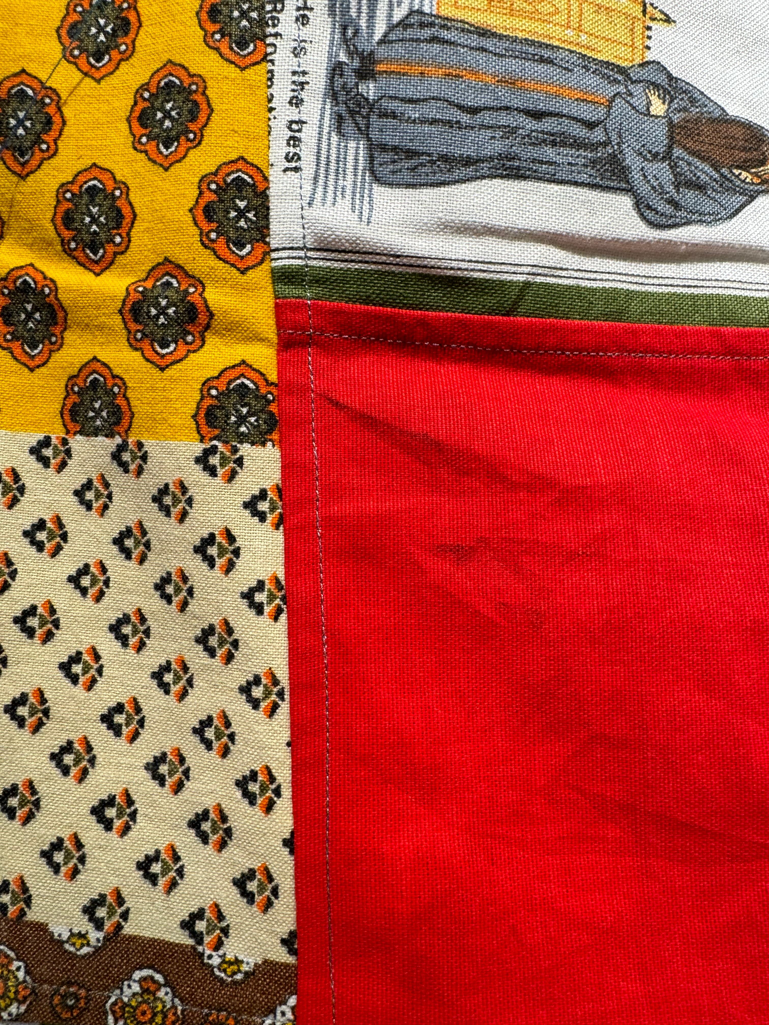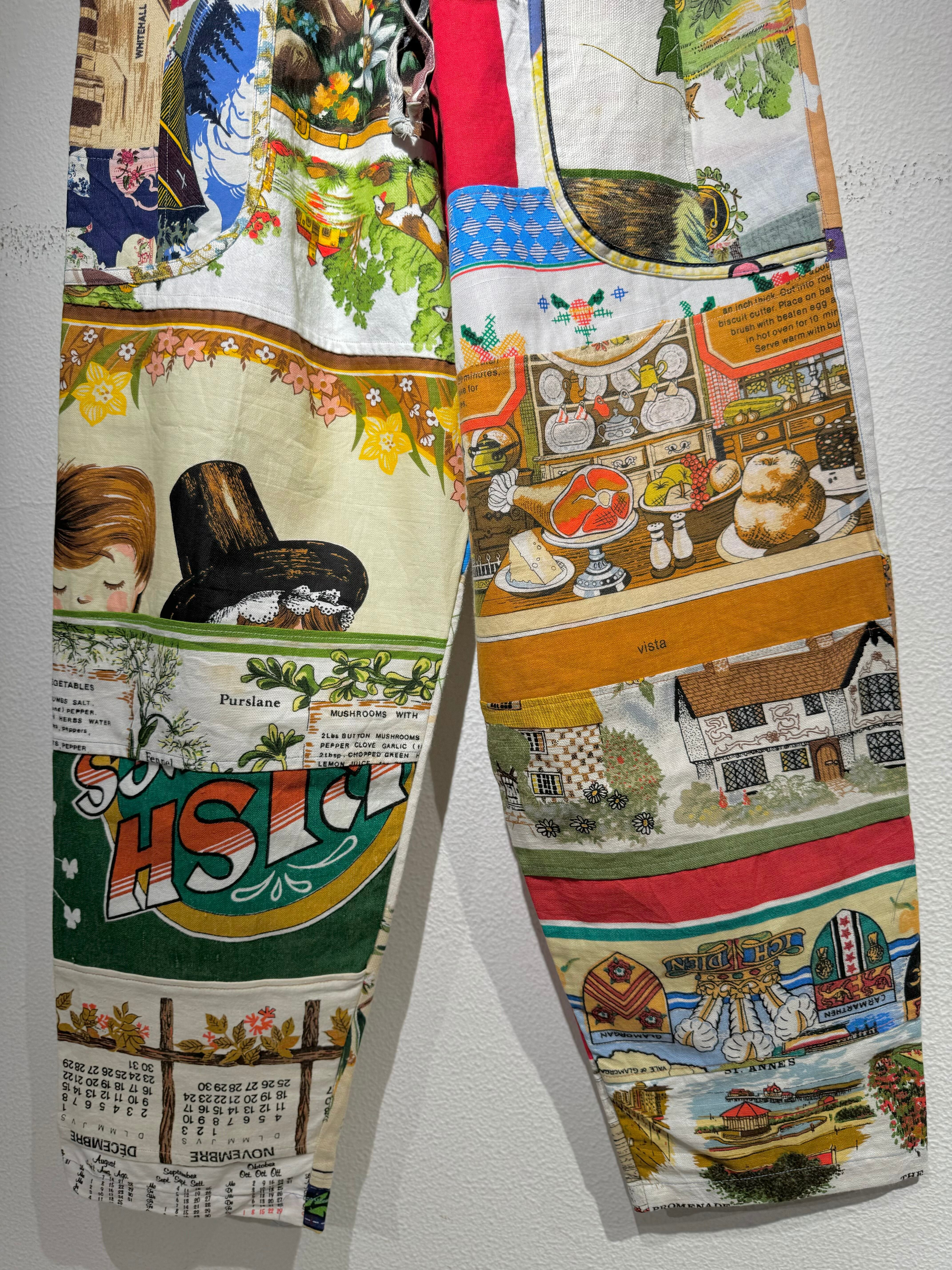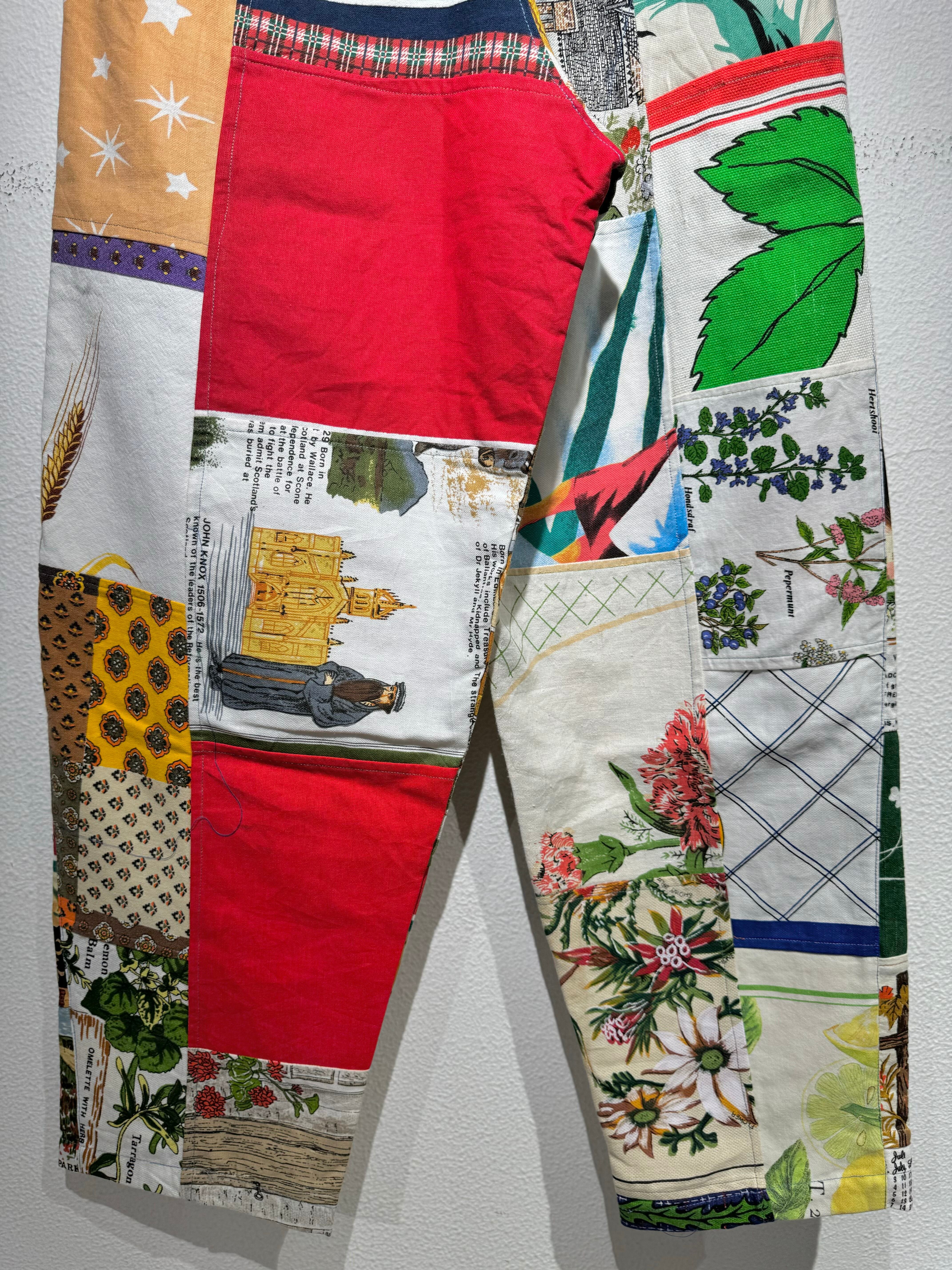 ビンテージのエコバッグやタペストリーを繋ぎ合わせたと思われるパッチワークパンツ。