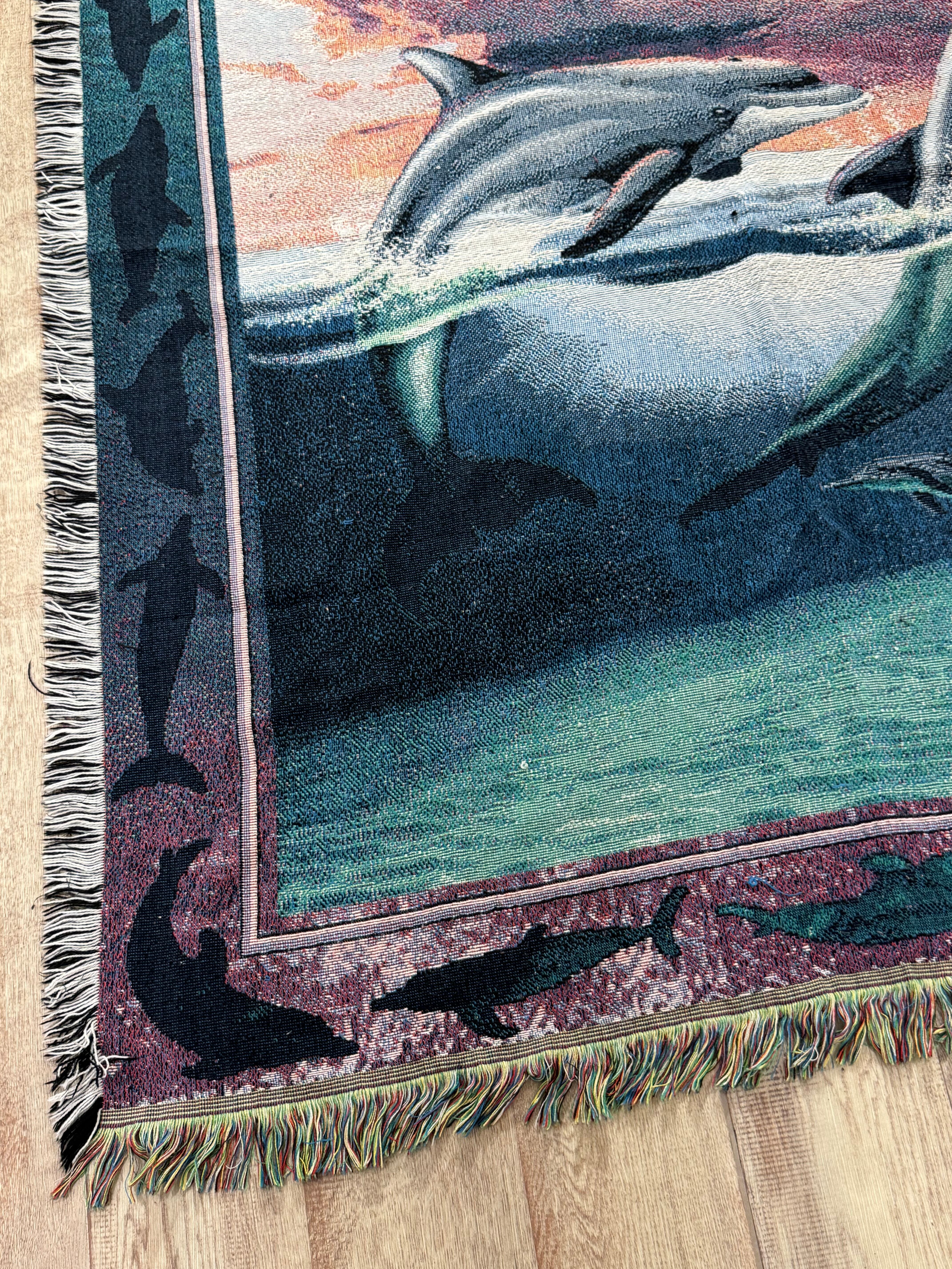 海を優雅に泳ぐイルカの群れが描かれたラグ。