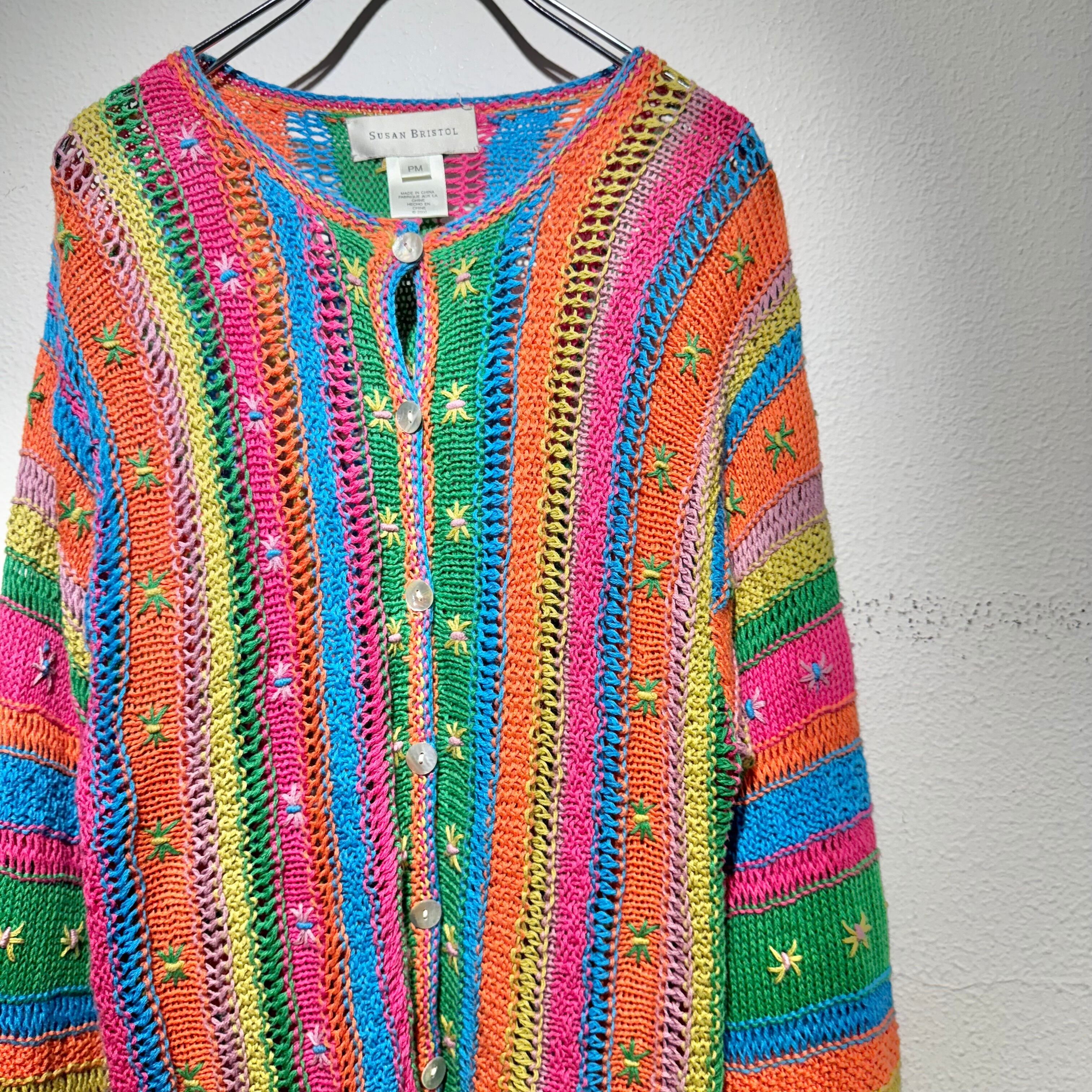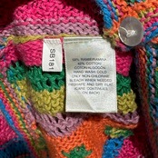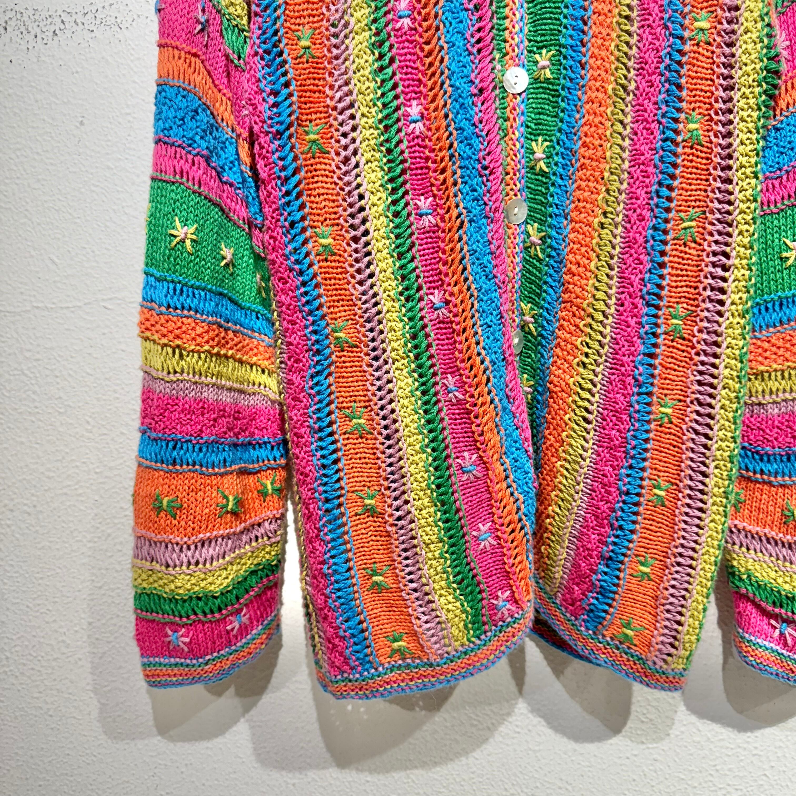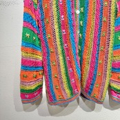 カラフルなカラーリングとざっくり編みが可愛らしいデザインカーディガン。