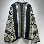 謎柄デザインのニットカーディガン。