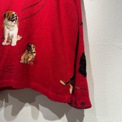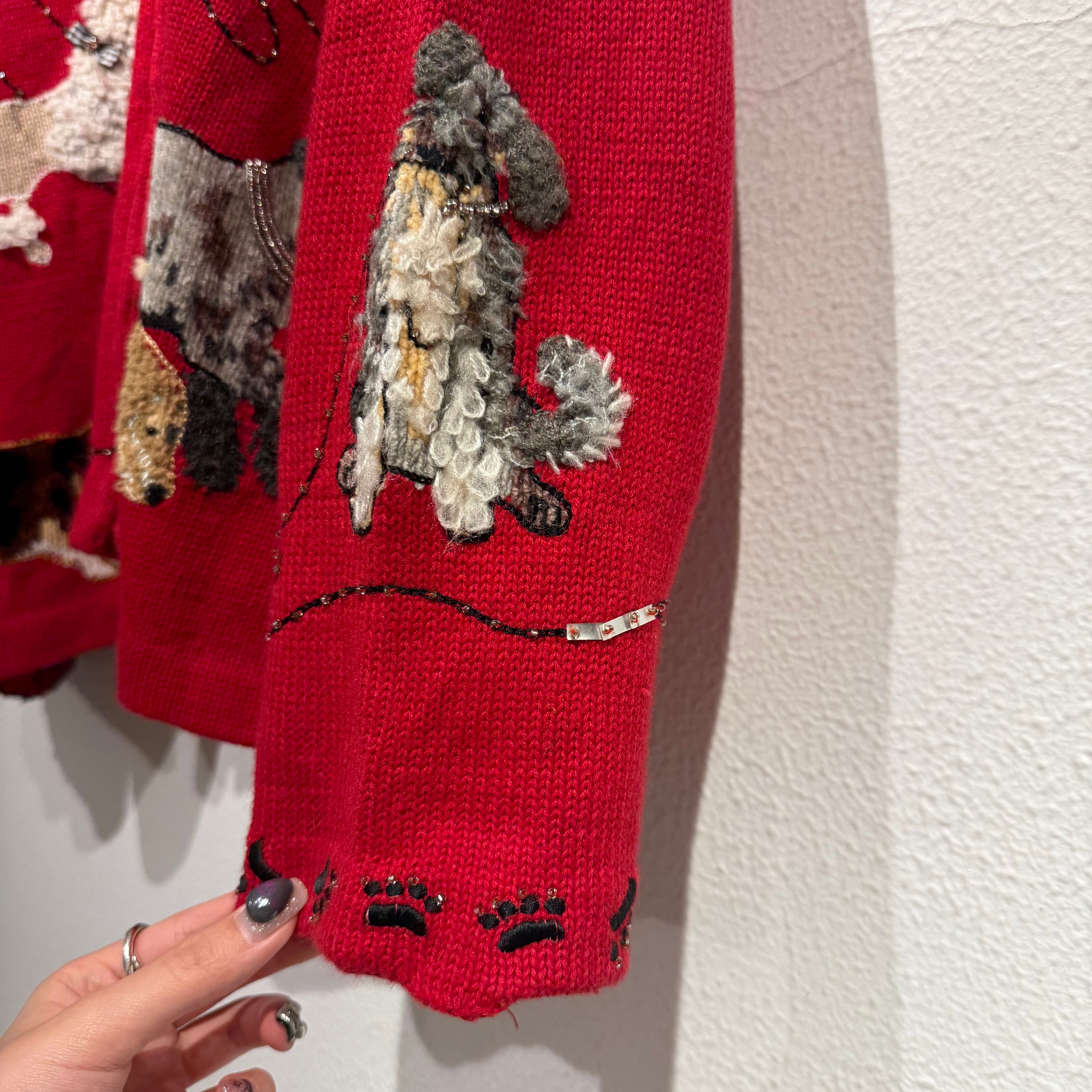 目を引く赤ボディのニットジャケットに、様々な種類のわんちゃんが刺繍されたスペシャルな1着。