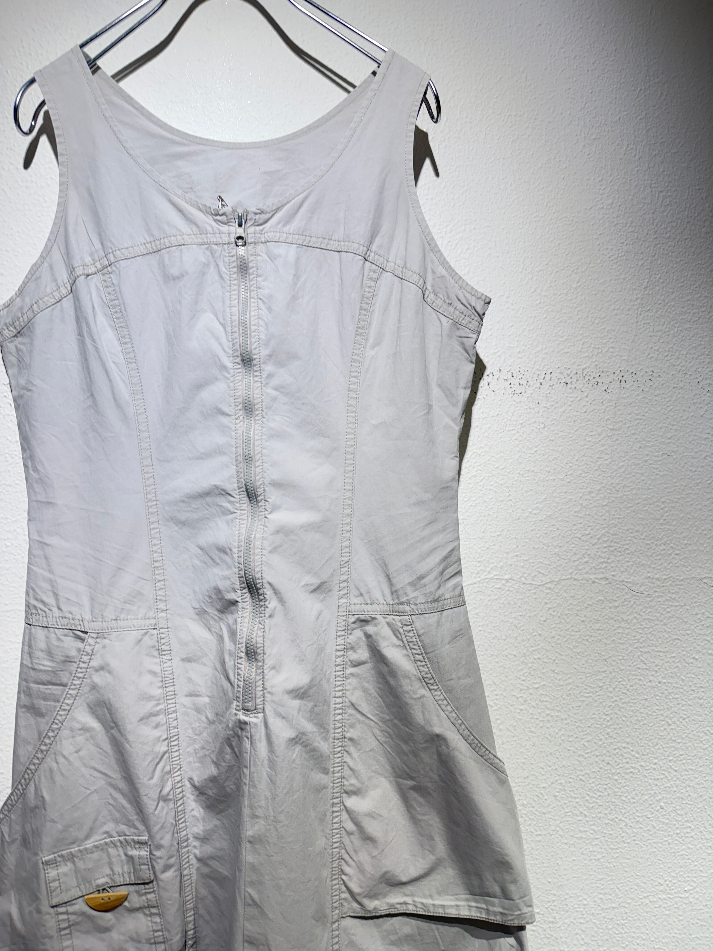 フロントのジップや変形ポケットなど個性的なデザインのワンピースです。